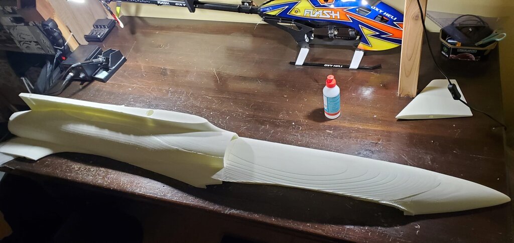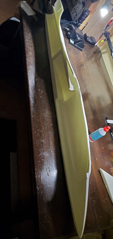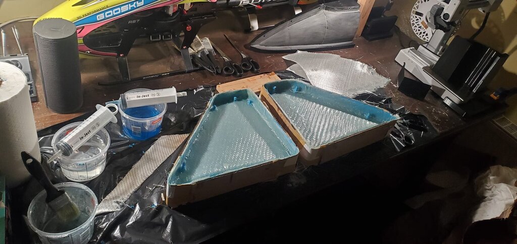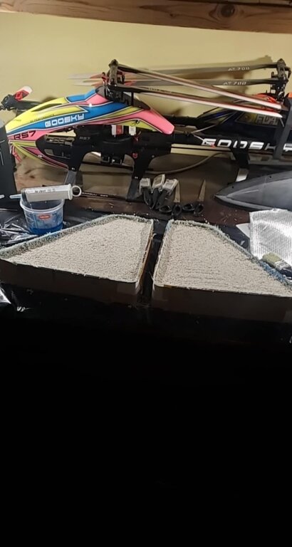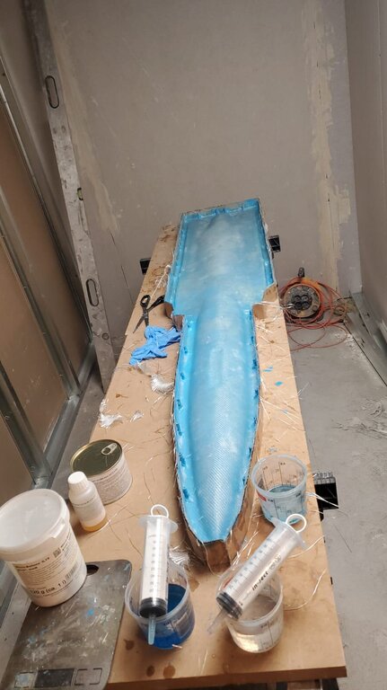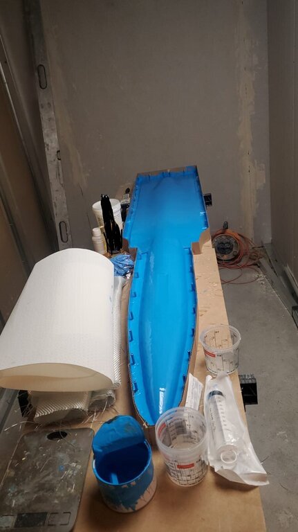 Trochę mnie tu nie było projekt miał mały przestój ale w sezonie kiedy jest super pogoda do latania to ciężko znaleźć czas na siedzenie w warsztacie. Aktualnie jestem na etapie robienia form na kadłub. Jedna już prawie gotowa. Formy na kadłub będą trzy ze względu na jego geometrie, inaczej nie dało by się wyciągnąć którejś połówki oraz samo laminowanie byłoby trudniejsze ze względu na trudno dostępne miejsca (a takie by były jakbym nie podzielił na więcej niż dwie połówki). Zdjęć z robienia formy mam dwa, jedno po drugiej warstwie żelkotu a drugie po którejś z wewnętrznych warstw tkanin, już nie chciało mi się rękawiczek ściągać żeby dalej foty strzelać. Technologia widziana już na tym forum więc nie będę jej opisywał. Aktualnie jeszcze przed polerką. Pozytywy na kolejne połówki i formę kabinki są w produkcji albo już są gotowe. EDF 110mm już kupiony więc teraz nie ma odwrotu, musi polecieć