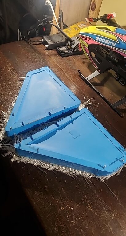 Przez dłuższy czas nic się w temacie nie działo więc wrzucam filmik z oblotu prototypu. Zrobiony jest z XPS i oblaminowany włóknem szklanym i węglowym, skrzydła są zrobione metodą vacuum bagging z mylarem 0.3mm. Lot wykonałem na pakietach 12s 3700mAh.