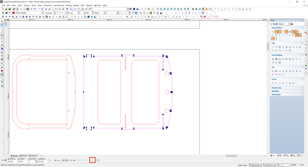 Zamykając temat... Z tym plikiem jest wszystko OK, tzn. jest pięknie przygotowany na laser. Problemem jest to, że Ty próbujesz go wyciąć na frezarce, więc masz program CAM, a CAM wymaga pełnych obiektów. Te wszystkie lasery tną po prostu plik po linii, dlatego sami robimy mostki i dodajmy offset promienia, typowo dla materiałów twardych 0.08mm. Na frezarce z kolei, CAM ma wygenerować gcode, i on sam uwzględnia offset narzędzia ew. mostki jeśli są dodane. Dlatego pliki muszą być 'czyste', pełne polylinie bez przerw. Resztę i plik masz na skrzynce pocztowej.