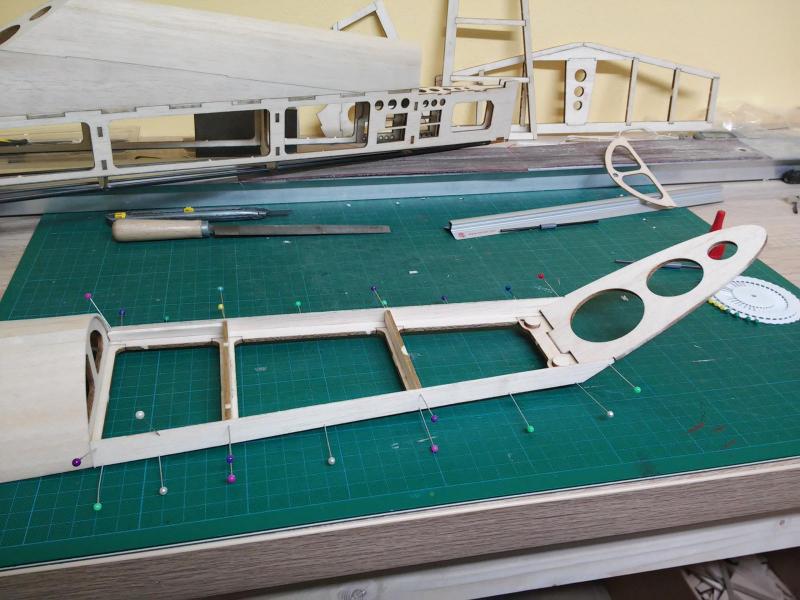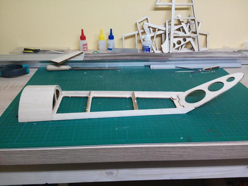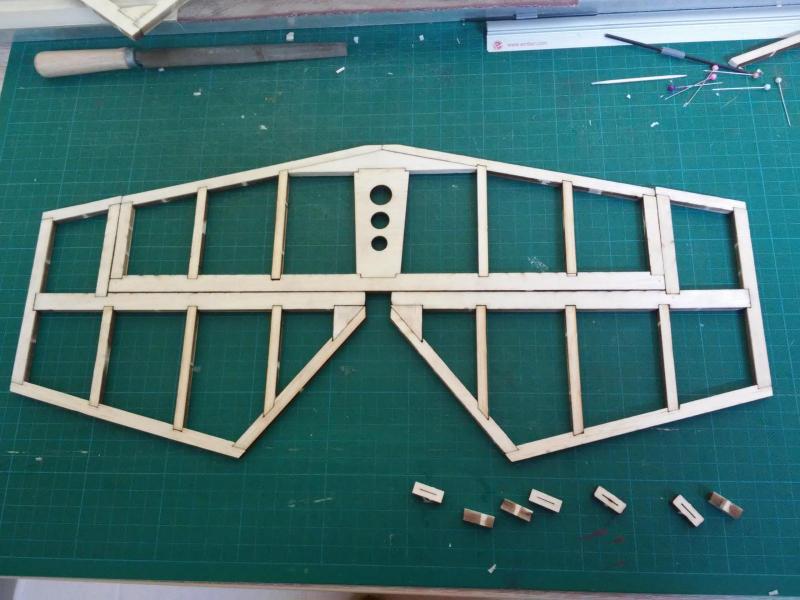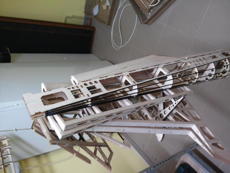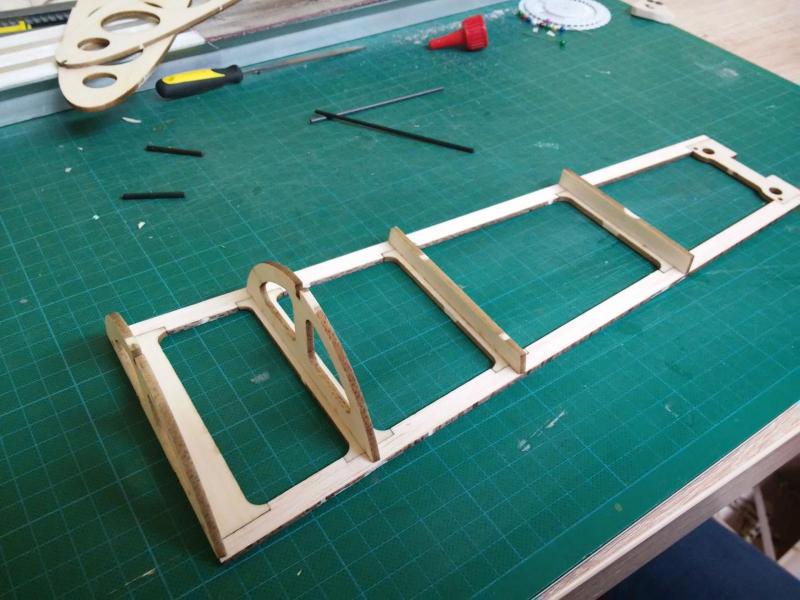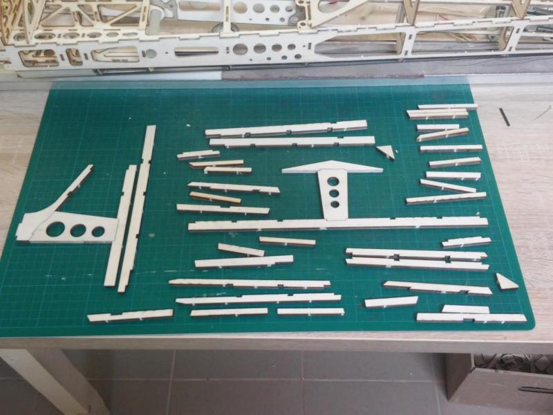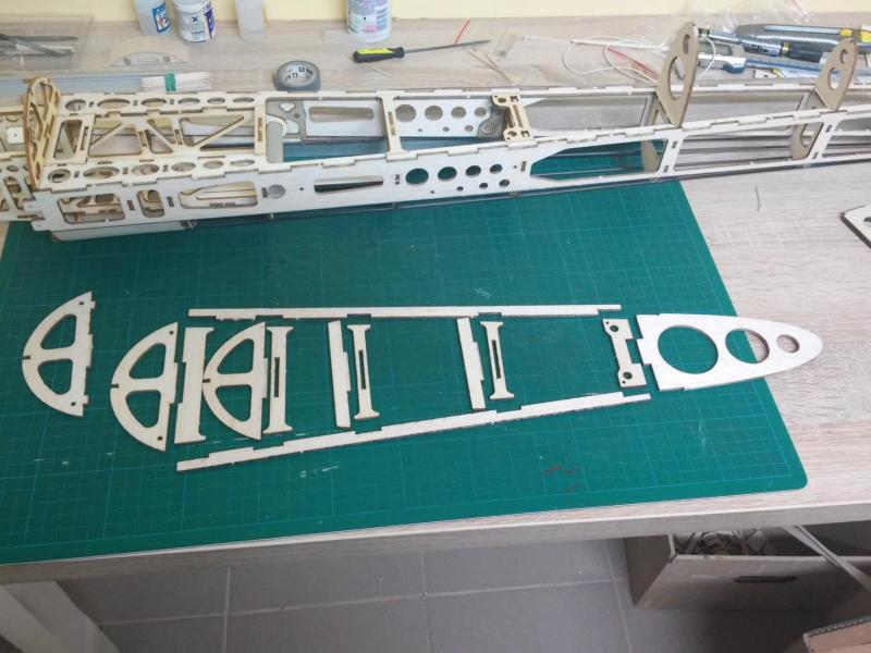 Dzisiejszy postęp: Sławku, co to za elementy mi zostały? Te obok stateczników.... I zagadka: ile waży całe drewno z węglami? Bez rury łączącej skrzydła - tak dla ułatwienia...