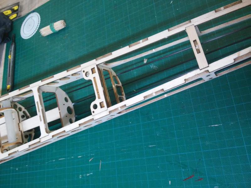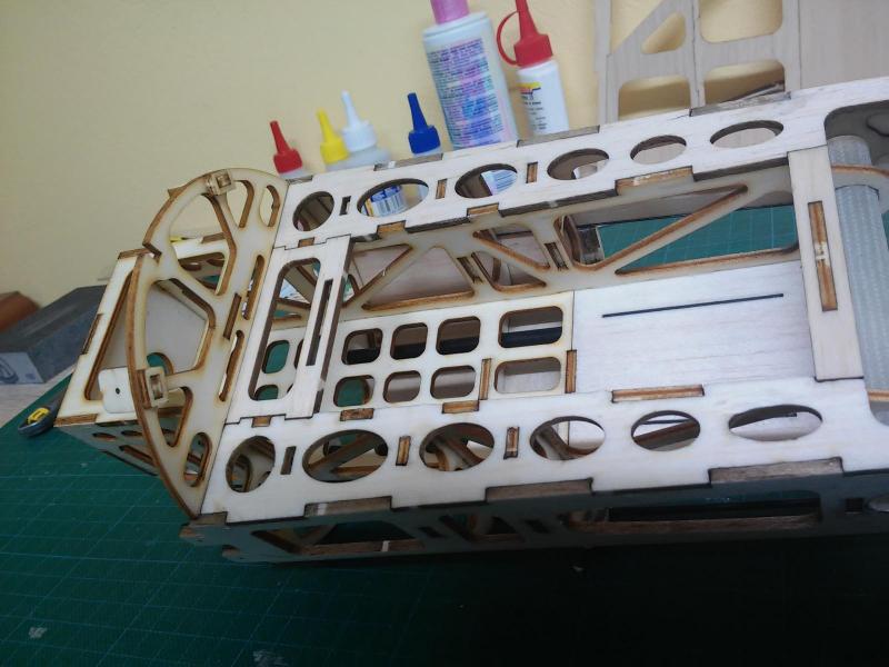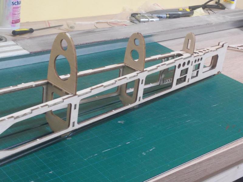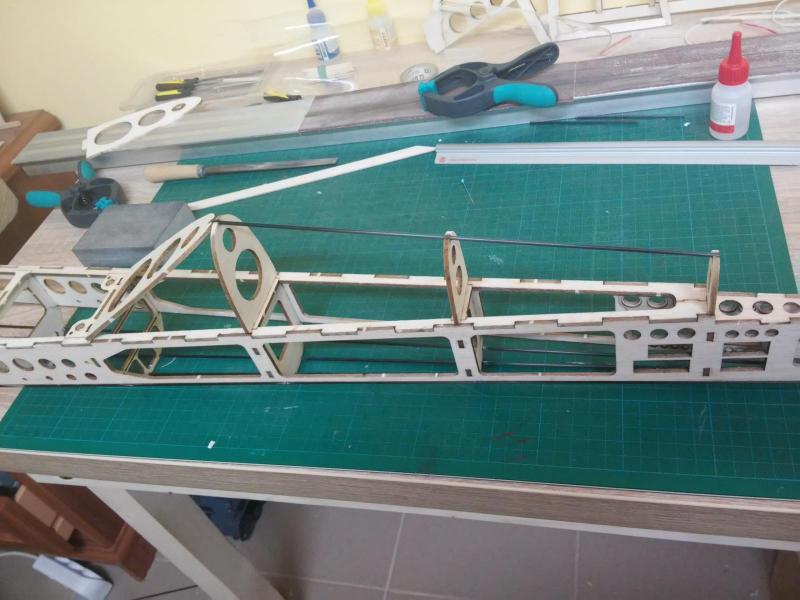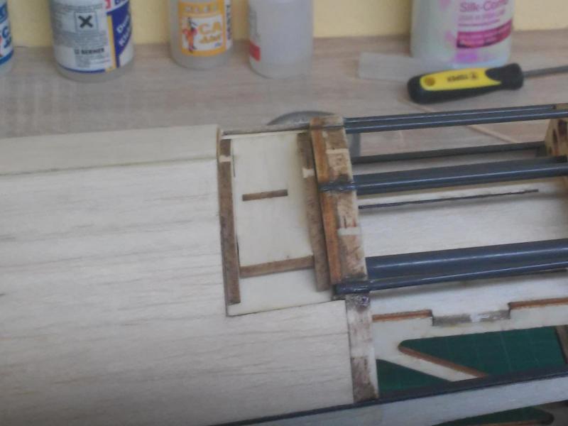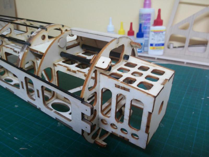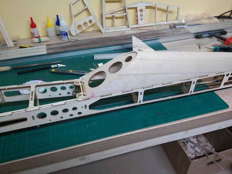 Dzisiejszy postęp: Sławku, co to za elementy mi zostały? Te obok stateczników.... I zagadka: ile waży całe drewno z węglami? Bez rury łączącej skrzydła - tak dla ułatwienia...