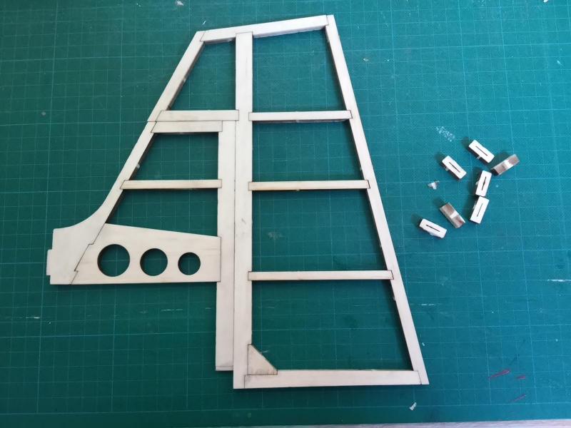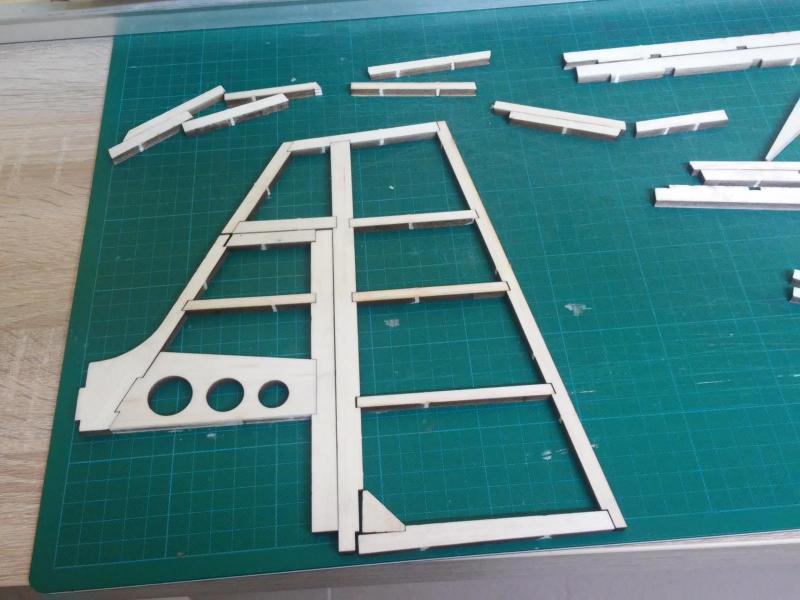 Żeby kompletowaniu stało się zadość, wyłożyłem na stół elementy ogona: 10 minut później: Kolejne 20 minut później: Zostało teraz podopieszczać tu i ówdzie po przerwach w ścieżce lasera i będzie można kleić... Nie znalazłem żadnego elementu, który połączyłby połówki steru wysokości, czyżby miały być dwie osobne dźwignie i popychacze?