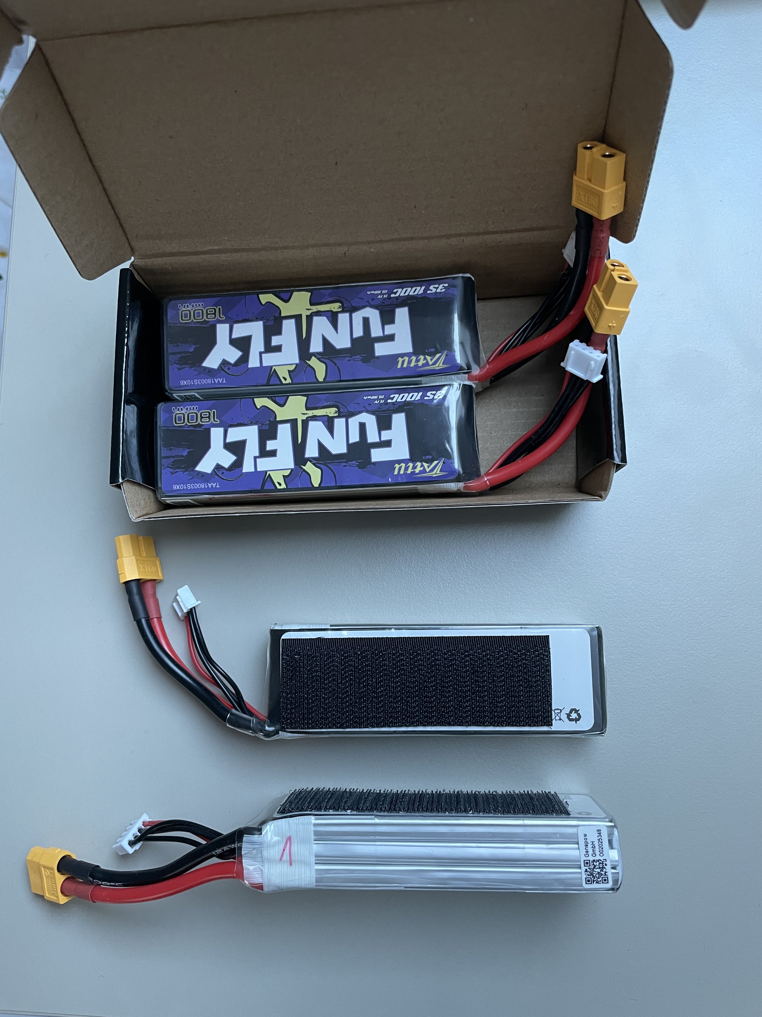 Rezerwacja całości dla WxxxxxFxx Cześć, sprzedam 4szt. akumulatorów Tattu Funfly 1800mAh 11.1V 100C XT60. Akumulatory przechowywane w napięciu storage, raz były w powietrzu, ładowane parę razy. Twarde, bez uszkodzeń mechanicznych. Cena za komplet 4szt. to 200zł lub 117zł. za 2szt. Przesyłka do paczkomatu Inpost w cenie. Pozdrawiam Piotr