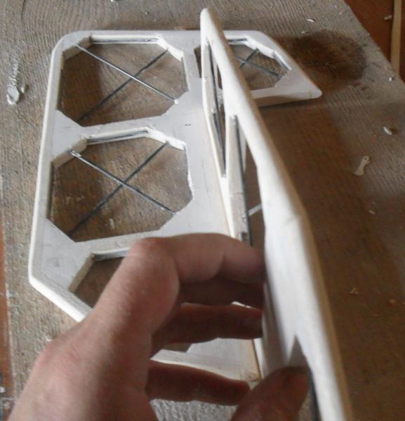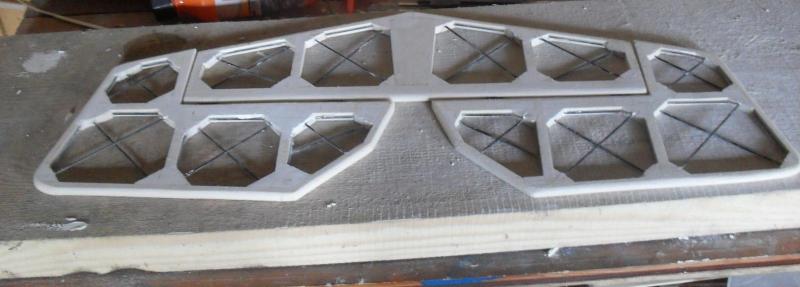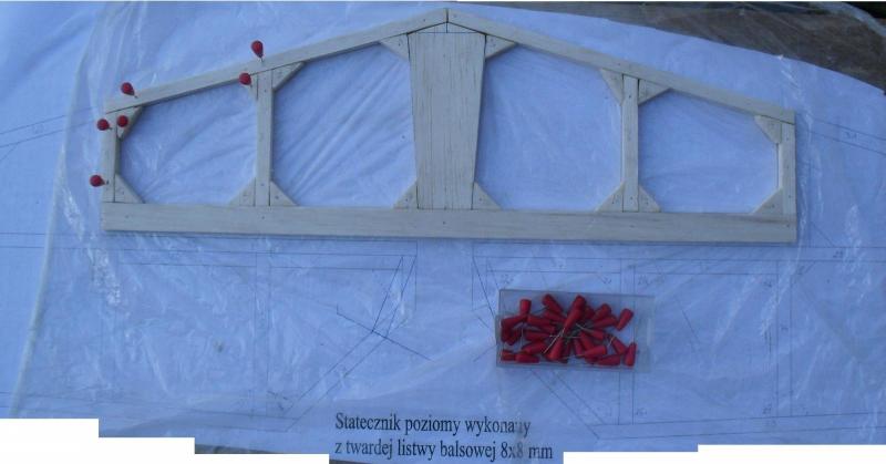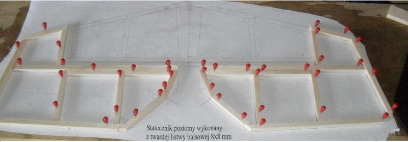 Trochę czasu minęło, ale na początku dały się we znaki upały, w moim garażu krytym blachą temperatura sięgała chyba 100st C, później ulewy, burze i ogólny armagedon więc siedziałem schowany w domu. Mało tego, po fali upałów i nagłym załamaniu pogody (Polak narzekać musi) przyszedł czas na pogodę zbyt umiarkowaną i miałem odgórny nakaz robienia wylewek i rąbania drewna na zimę. Wczoraj i dziś wreszcie mogłem troszkę podłubać popołudniami. Postanowiłem zabrać się za statecznik poziomy i ster kierunku, na zadowalająco równą deskę wygrzebaną z garażu nakleiłem kawałek planów i przykryłem go kawałkiem folii. Następnie z deski balsowej 8mm powycinałem listewki używając zrobionego przez siebie narzędzia (coś na ten kształt http://www.modelmaniak.pl/index.php?option=com_content&view=article&id=51:uniwersalna-wycinarka-do-listew-modelarskich-zpm-w-lutowym-modym-techniku&catid=22:narzdzia&Itemid=19 ). No i oczywiście wszystko przygotowałem i nakleiłem: Jak widać uciekłem trochę od oryginalnych planów bo gdzieś wyczytałem że potrzeba trochę więcej miejsca na ster kierunku. Podglądnąłem kilka relacji z budowy madmana i znalazłem pomysł na pewne wzmocnienie, są to pręty węglowe 2mm, wklejone w kratownice i wzdłuż balsy od środka: Dokładne spasowanie elementów (szczególnie trójkątnych wstawek) przychodzi mi z pewną trudnością, z budowy poprzedniego modelu wiem ze te nierówności odbiją się czkawką przy pokrywaniu folią więc postanowiłem użyć troszkę szpachlówki do drewna. Oto efekt końcowy: Na sam koniec dzisiejszego dnia wstawiłem zawiasy, na razie bez kleju i oszlifowałem krawędzie. Na krawędzi z zawiasami by ster miał większe możliwości i by jeśli dobrze rozumiem zapobiec "trzepotaniu". efekt mi się spodobał więc przejechałem resztę zewnętrznych krawędzi pomijając dwie najkrótsze boczne na łączeniu sterów ze statecznikiem: Jeśli mogę sobie pozwolić to mam radę dla wszystkich początkujących. Jak wam się nie podoba to co wychodzi z pod waszych palców to po trzecim piwie ten stan wam minie. Na koniec zdjęcie mojej "pomocnicy" która głośnym szczekaniem co sekundę domaga się rzucenia piłeczki: