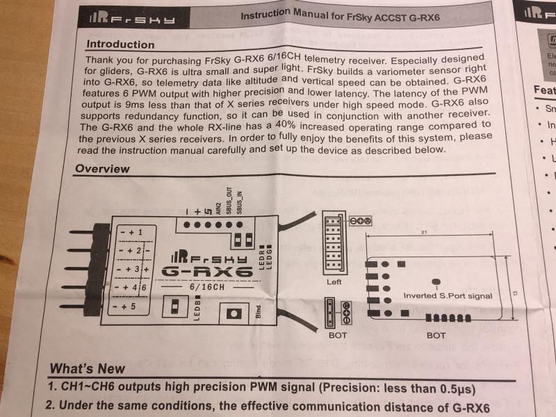 9. To nawet nie są jaja - to jakaś checa ze strony FrSky!!!! Adam masz całkowitą rację!!! Ale spójrzcie! Bez Was i bez tego forum nigdy bym się nie odważył wpiąć serwa tak jak pokazuje to Adam!!!! Dlaczego? Na mojej instrukcji G-RX6 nie ma tego schematu, który Adam zakreślił na czerwono. Cała reszt jest identyczna. Automatycznie użytkownik (przynajmniej ktoś taki jak ja) sugeruje się opisem na odbiorniku i aby się czasem nie pomylić obraca go bokiem i patrzy: aha ten pin idzie do minusa, ten do plusa a ten sygnałowy.Oznakowania znajdują się bowiem dokładnie i bezpośrednio nad pinami!!!!!!!!!! No bardziej dokładnie nie można tego odczytać a to całkowicie błędna metoda Może gdyby odbiornik był obudowany wówczas rzeczywiście można te oznaczenia odpowiednio przypisać ale tu człowiek patrzy i dokładnie widzi co gdzie jaki pin do czego idzie!!! Bardzo Wam dziękuję za pomoc i zaangażowanie. Przepraszam za tak kardynalny błąd lecz spróbuję Wam to pokazać na zdjęciach. P.S. Wszystko działa na całe szczęście, a Taranis już jest moim przyjacielem