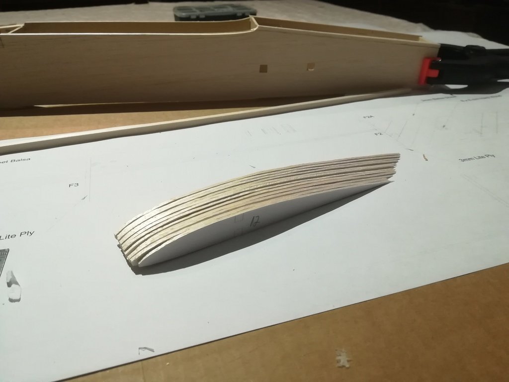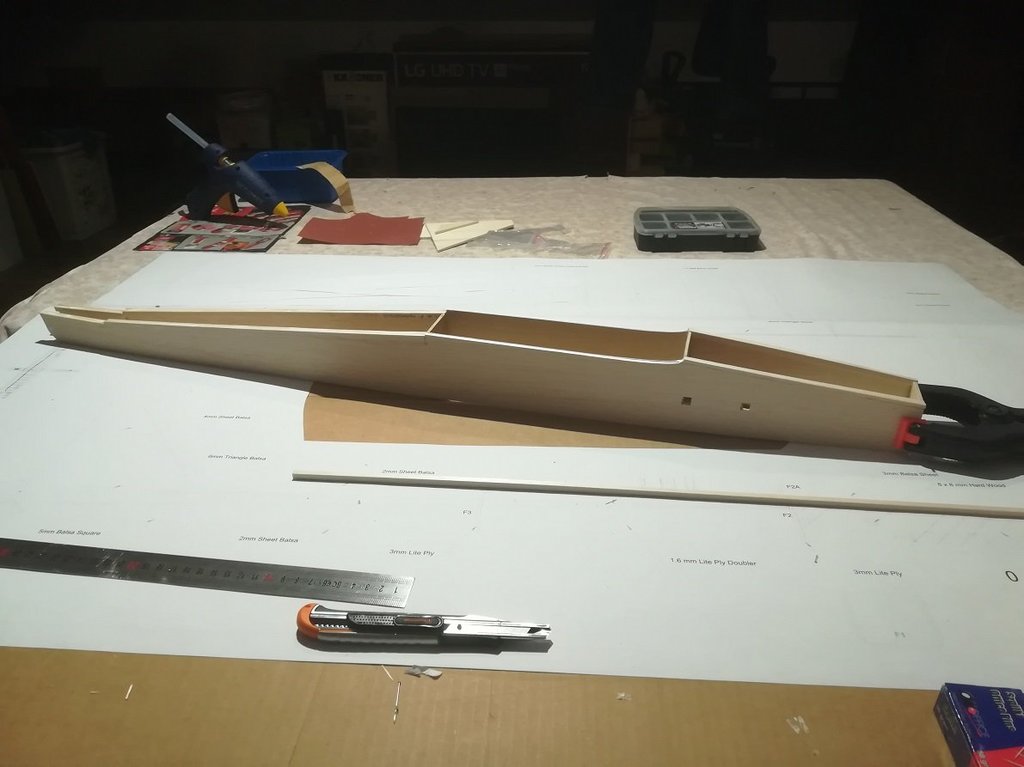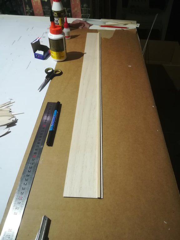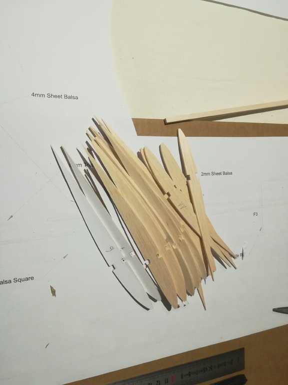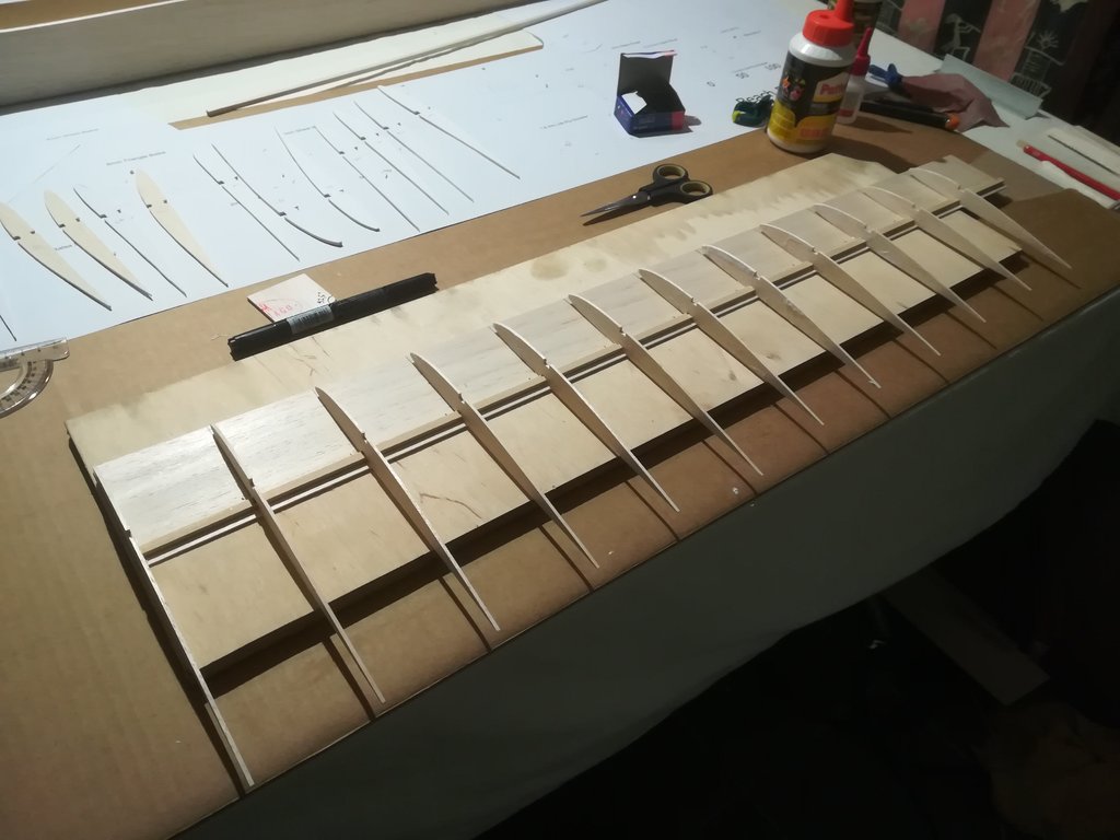 Kadłub odstawilem na razie na bok. Zostały wycięte żeberka I dalej przykleiłem dźwigar do kesonu (taka kolejność wyczytalem o ile dobrze pamietam w jakiejś instrukcji W. Schiera) no i przykleiłem żeberka. Zastanawia mnie tylko kwestia łącznika. W planach jest taki ze sklejki wyciety lecz nie ma rozrysowanego sposobu ani miejsca jego wklejenia. Inny model znaleziony w internecie mial sklejone ze sobą płaty bez łącznika tylko za ponoca tkaniny i żywicy.