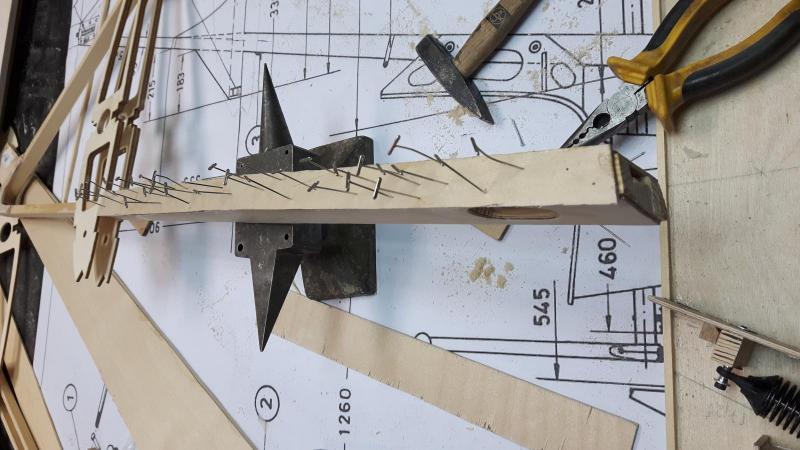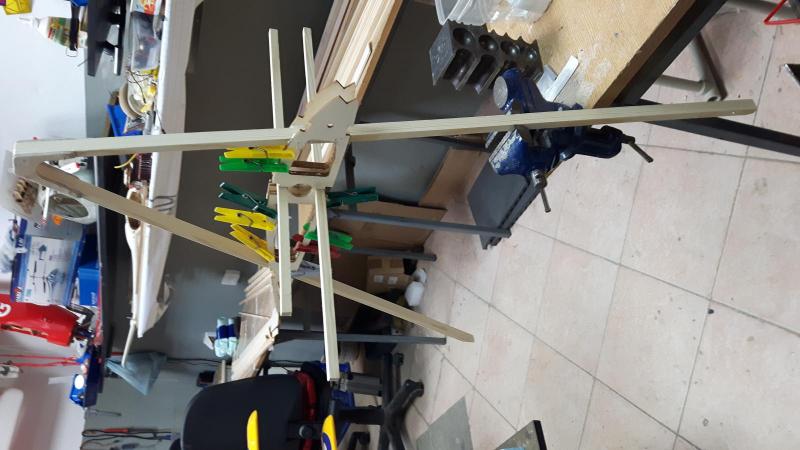 .Witam Pracę idą w pracowni Andrzeja wycinanie na laserze Żeberka Jak pomieścić na biurku rozpiętość jednego płata to 1700 a część robocza 1500 tu jest pomocna zastosowanie centro płata, zdaje sobie sprawę będzie tu wielu krytyki podchodzę do tego zagadnienia ma to być półmakieta. Naciągi wanty pozostają to istotne utrzymanie sporego skrzydła. Centropłat złożony na sucho. Jutro wybieram się do Ryku po niezbędne listewki .Mam telefon do modelarni dostarczone mam rysunki wyskalowane kończę jutro podzielę co mam za plany. Listewki i tak będę musiał kleić w handlu są gro metrowe. Pozdrawiam Marian