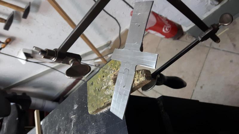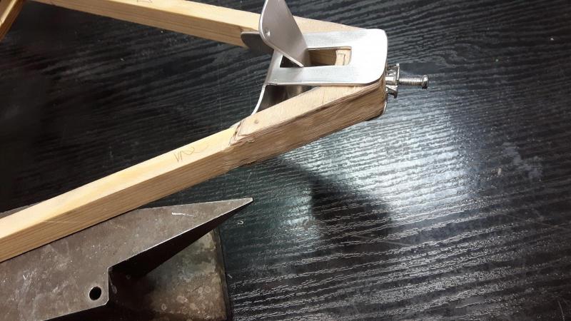 Witam Dziś zajęcia z ślusarki poszukałem dostępne materiały na napinacz w wieżyczce naciągów (want). Wytrasowałem na blaszce aluminiowej grubość to 1,8 mm mogła by być grubsza robię taki posiadam materiał wycinanie. Podczas gwintowania szukam innych rozwiązań w głowie cienka blaszka czy wytrzyma . Powstał motyl część napinacza ukształtowany. Obudowa napinacza wypiłowana ukształtowana. Poskładany napinacz będzie mocowany do wieżyczki od spodu jak i na górze na śruby jak zwykle mam garść ale nie takie długie jak potrzebuję nie wiercę nie wiem co jutro kupię. Przymiar na sucho napinacza mam do jutra przemyślenia, czy dać nakrętkę kłowa na wierzchu wstawiając klocek czy wzmocnić inaczej.Poproszę o podpowiedz czytających to miejsce ma unieść całą wagę płata. Pozdrawiam Marian Oj zapominałem o tej fotce to rozkojarzenie.Przepraszam