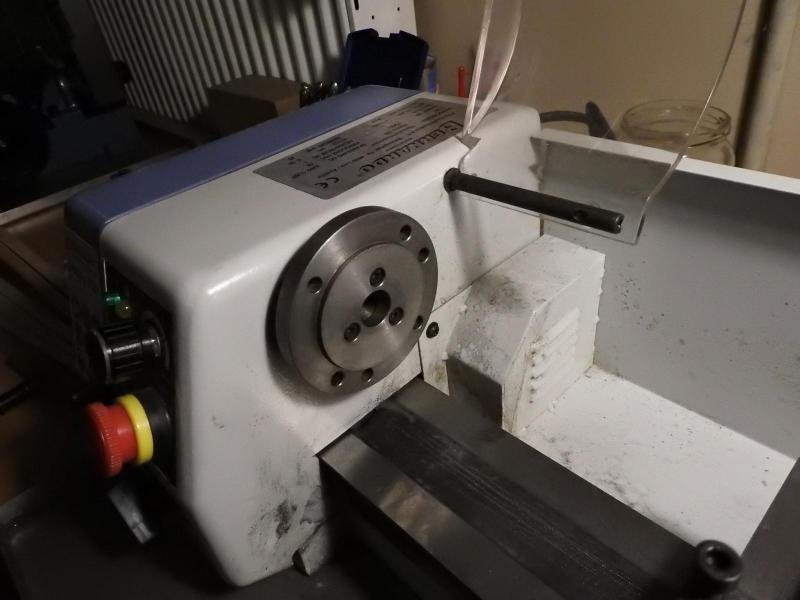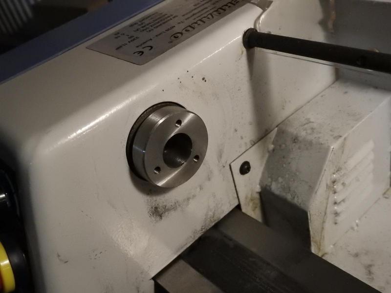 Zara zara. Idę odrkecić starą tarczę i pokażę o co chodzi. Moment. Tak wygląda obecna tarcza zabieraka. Średnica zamka 56mm pod chiński uchwyt. Średnica zamka pod polskiego BISONA to 57mm, zatem potrzebuję nową tarczę zabieraka. Po demontażu tarczy tak wygląda wrzeciono. Zamierzam zamówić prefabrykat wycinany laserem z blachy 10mm, zamontować na wrzecionie i dotoczyć zamek na głębokość 1mm. Prefabrykat będzie miał 80mm średnicy i trzy dziurwy fi6 do zabazowania na wrzecionie.