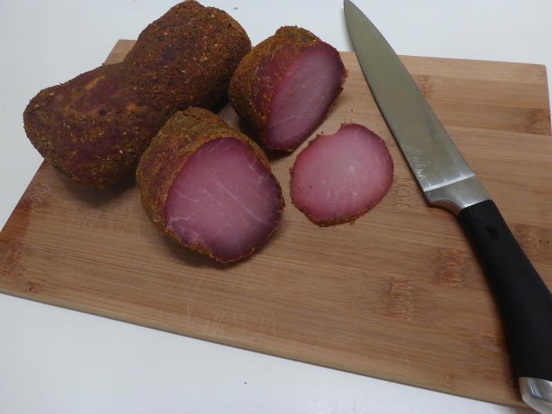 Leszku, zacytuję wpis z bloga mojego kolegi, który ładnie podsumował: "Wiedziony inspiracjami z grupy Facebookowej Wędzarnicza Brać postanowiłem po raz pierwszy zrobić wędlinę dojrzewającą. Wybór padł na to, że pierwszy raz będzie schab. Równie dobrze mógł być to karczek, lub boczek. Karczek na pewno będzie następnym razem. Niezależnie od tego jakiego mięsa byśmy użyli przepis jest ten sam. Efekt był dużo bardziej niż zadowalający. Jeśli chodzi o wygląd, to możecie go ocenić na podstawie zdjęć. Jeżeli chodzi o smak, musicie mi uwierzyć. Robienie takiej wędliny ma też jedną dosyć spora wadę. Czas oczekiwania na gotowy produkt jest odwrotnie proporcjonalny do czasu w jakim taki schabik znika na skutek konsumpcji. Generalnie jedzenie go wciąga jak paluszki. Ale przejdźmy do sedna, czyli do przepisu. Mam nadzieję, że nikt z Wędzarniczej Braci nie będzie mi miał za złe, że go tutaj publikuję. Składniki: Schab bez kości - około 1 kg Cukier - 3/4 szklanki Sól kamienna/Morska (niejodowana) - 3 łyżki Peklosól - 1 łyżka Majeranek - 1 łyżka Kolendra (ziarna) pół łyżki. pieprz czarny w ziarnkach - 1 łyżeczka Papryka słodka - 1 łyżka papryka słodka wędzona - 1 łyżka. czosnek granulowany - 1 łyżka Pończocha/rajstopa lub gaza opatrunkowa. Sznurek masarski albo szpagat. Wykonanie: Schab myjemy, osuszamy i oczyszczamy z wszystkich błon. Następnie tak obkrojony schab obtaczamy dokładnie w cukrze (tak nie przesłyszeliście się - w cukrze), wkładamy do pojemnika (najlepiej zamykany pojemnik spożywczy plastikowy lub szklany), ale tak, żeby nie leżał bezpośrednio na dnie. można wstawić tak jakiś ruszt, czy to będą zakrętki od butelek, czy podkładka pod garnek, cokolwiek co spowoduje, że mięso nie będzie leżało w wodzie, którą puści. Tak przygotowane mięso wkładamy do lodówki na 24 godziny. W połowie czasu można je przekręcić, żeby użyty przez nas ruszt nie wbił się za mocno z jednej strony. Po 24 godzinach całość wyjmujemy z lodówki. Schab opłukujemy pod zimną wodą z resztek cukru, które na nim pozostały. Od razu osuszamy dokładnie ręcznikami papierowymi. Myjemy również pojemnik oraz ruszt. Mieszamy se sobą sól i peklosól. W takiej mieszance dokładnie obtaczamy mięso, a następnie układamy w naszym pojemniku na ruszcie podobnie jak to robiliśmy dzień wcześniej. Również wstawiamy na 24 godziny do lodówki, również w połowie czasu dobrze by było odwrócić mięso. Po upływie kolejnych 24 godzin szykujemy naszą mieszankę przypraw. Kolendrę i pieprz miażdżymy dosyć dokładnie w moździerzu. Następnie wszystkie składniki przypraw ze sobą mieszamy. Mięso wyjmujemy z lodówki, opłukujemy z soli pod zimną wodą, osuszamy dokładnie papierowymi ręcznikami. Z pojemnika odlewamy wodę i myjemy go. Schab otaczamy dokładnie w naszej mieszance przypraw. Tak obtoczony schab znów układamy w naszym pojemniku i chowamy do lodówki na 24 godziny. Odwracanie nie jest już tak bardzo konieczne, bo jak zauważmy schab robi się juz coraz bardziej zwarty (stracił sporo wody) i coraz mniej podatny na odkształcenia. Po 24 godzinach Wyjmujemy całość z lodówki, tym razem już nie opłukujemy, tylko razem z przyklejonymi przyprawami pakujemy w pończochę, rajstopę albo gazę, mocujemy do tego sznurek i wieszamy w suchym, przewiewnym miejscu. U mnie była to rura od grzejnika w kuchni, przechodząca obok okna, które jest wiecznie uchylone. Tak przygotowane mięso musi wisieć od 7 do 14 dni. W zależności od tego jaki efekt pragniemy uzyskać. Dobór przypraw jest dowolny. To co zaprezentowałem w przepisie to tylko sugestia, każdy powinien sobie dobrać takie przyprawy jakie lubi. Można zrobić też na ostro dając zamiast słodkiej, ostrą paprykę. Wszystko wedle gustu. Moje mięso wisiało 9 dni. Jak dla mnie akurat - następnym razem spróbuję skrócić czas do 7 dni i zobaczę jaki będzie efekt. Najważniejsze jest to żeby je później bardzo, ale to bardzo cieniutko kroić. "