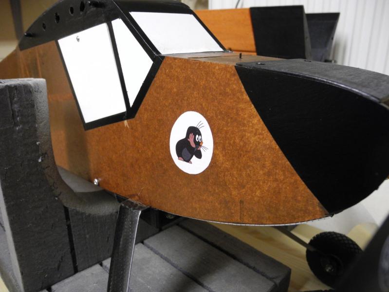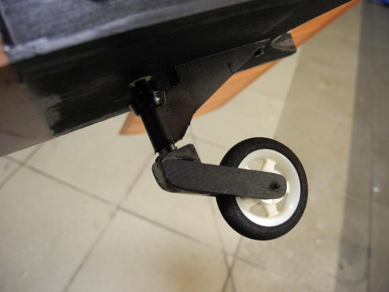 25. Takiego cusia wystrugałem w miejsce zaginionego w akcji: Nieamortyzowane, bo pilot zobowiązał się lądować delikatnie Klocek bukowy, dwa kawałki sklejki lotniczej 2,5mm, pręcik węglowy fi 2mm.