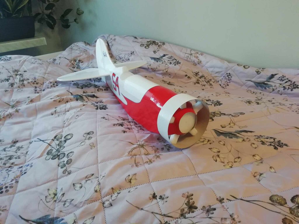 Krycia taśmami pakowymi bym nie skreślał , jeśli robisz model z białej pianki sprawdzą się dobrze takie taśmy ale kolorowe a nie standardowa "szara" . Koszt/efekt niezły , jedna rolka starczy na kilka modeli . Przyrost wagi żaden, wzmocnienie zauważalne a przy starannym oklejaniu nie będzie wyglądać jak paczka kurierska Ewentualnie napisy , dekoracje można nakleić wycięte z foli "okleinowej" . Poniżej przykład . Żółta taśma pakowa i czarna folia