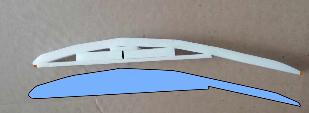 Założyłem sobie już na samym początku profil wklęsły ....ale rozwiązania budowy skrzydła częściowo zapożyczyłem z konstrukcji typu "Armin" a "łamana" górna linia profilu może się kojarzyć z FliteTest. Dźwigar gł. to płaskownik węglowy 6x1 plus wklejony w wewnętrzną warstwę w skrzydle, listewki sosnowe na spływie i krawędzi - te ostatnie zastosowałem nie dla dodatkowego usztywnienia konstrukcji a dla zabezpieczenia między innymi przed gumą na którą skrzydło będzie przyczepiane. Aktualna waga pokrytego folią i taśmą pustego modelu to ~190g - teoretycznie jak dojdzie wyposażenie , podwozie .. to spodziewam się wagi w okolicy 450g do lotu i obciążenia ~ 22.5/dm , przy konfiguracji na 3S .
