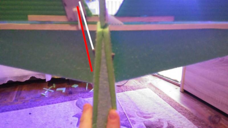 19. Listewki Twoje zdaje się że mają 6mm szerokości -dziury je osłabią dla tego wybrałem dla ciebie opcje z "wgłębieniami" Jeśli prawidłowo zrobiłeś "klocek" to przedni kołek właśnie powinien go przebić Jeśli mówisz o tylnym kołku to zgadza się - przebijasz się tylko przez burty Po założeniu gum na skrzydło siła rozciągająca będzie ciągnęła kołki do góry. Pomyśl jak słabo by był zamocowany kołek bez listewki (która zabezpieczy płaszczyznę mocowania skrzydła i nie pozwoli kołkom na wyrwanie się z kadłuba . Górne "wgłębienia" pewniejsze, dolne łatwiejsze w wykonaniu , możesz zastosować które chcesz