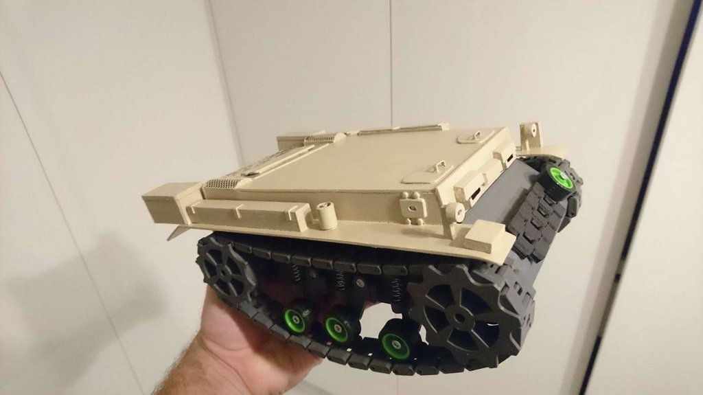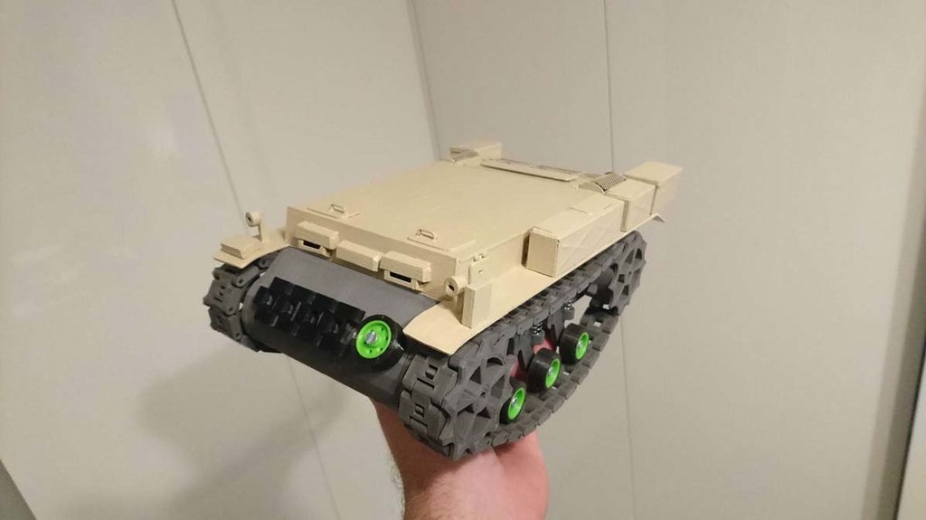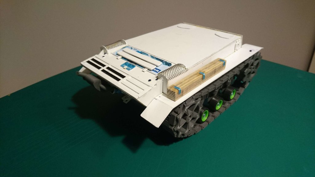 13. Po moim względnie udanym czołgu LUCHS zrobionym na drukowanym podwoziu Przemka odrobinkę się rozochociłem... Tym razem wypadało zrobić coś mniej "cartoon" a bardziej "real" (w moim przypadku to pojęcie względne.. ) Bazując nadal na uprzejmości Przemka i jego poprawionym projekcie trakcji gąsienicowej wszedłem w posiadanie jego gąsienic i zawieszenia według już mojej TFU-rczości w 3d upodobnionego to tego co widać wyżej (zdjęcie poglądowe) Całość czołgu robiona ze starych plastikowych płyt reklamowych walających się po mojej pracy .. Poniżej kilka fotek z postępów prac , nie jest to zegarmistrzowska robota jaka możemy zobaczyć np u Darka i jego holowniku Atlas ale akurat taka by zabić czas siedzenia w domu i coś tam bez spinki sobie skrobnąć .. Oraz przymiarki podwozia Przez całkowity przypadek okazało się że model powstaje dokładnie w skali 1/16 CDN