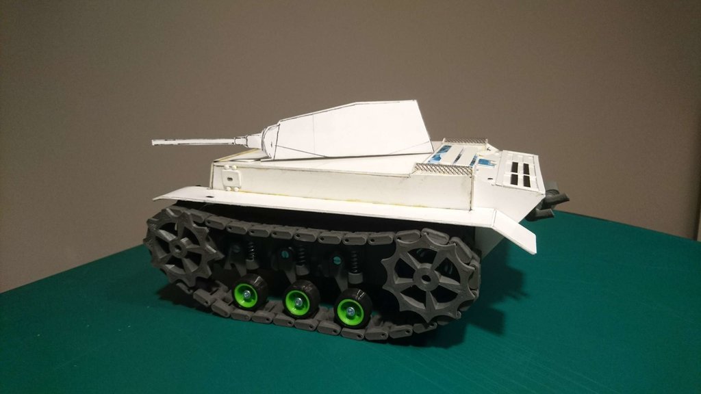 25. Zostałem posiadaczem Pierwszej wersji podwozia dzięki uprzejmości Przemka więc trzeba coś z tego zrobić.. Widać że Przemek włożył dużo uczciwej pracy i pomysłów by można było skręcić z tego podwozie a nie kupkę wydruków , wszystko pięknie pasuje. Brak mi kilku śrubek bo mi nie po drodze do sklepu ale myślę ze niebawem dokończę je uzbrajać w napędy . Górę robię od podstaw , z czego się da , plastik .metal , nawet drewno , wszelkie manele z szuflady "przyda się" Ma z tego wyjść PzKpfw II LUCHS (jak się uda) , oczywiście w proporcjach kreskówkowych . Z racji śmietnikowych materiałów i braku talentu wychodzi na razie to co widać . a jedyny na nim fajny element to tłumik który też Przemek wrzucił do paczki ..:) Drobne poprawki , kolejne detale i malowanie powinno dużo zmienić . i przymiarka szablonu kabiny