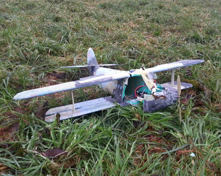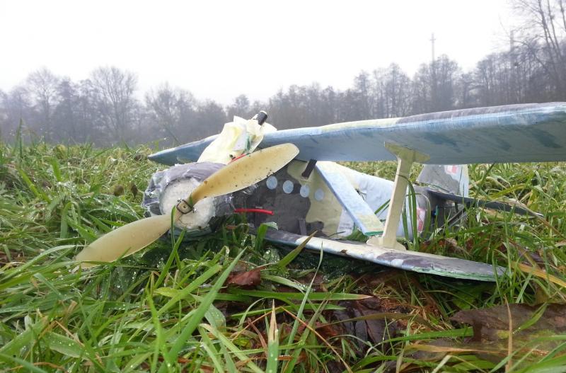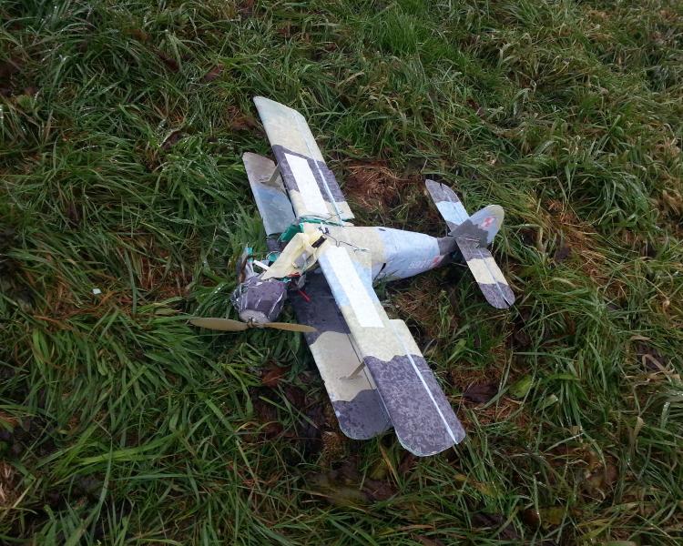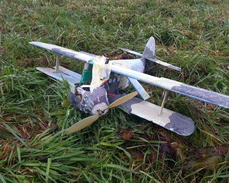 Chciałem w końcu zrobić model pełno kadłubowy, jak pomyślałem tak zrobiłem. Niestety za pierwszym razem wleciałem w jakiś "przeciąg" i zawisł w powietrzu po czym przeciągnęło go i kretował, straty małe, naprawiłem. Następnie podczas kolejnego lotu gdy dałem gaz na maksa silnik zaczął działać na 10%, naprawiłem skrzydło, wymieniłem akumulator i kolejny lot przebiegał lepiej ale mniej mocy + braki w umiejętnościach spowodowały poniżej widoczne uszkodzenia. A taki był ładny, radziecki Morał z tej bajki taki, że modele dwupłatowe mają tendencję do bocznego przeciągania - teraz zrobię spitfire`a