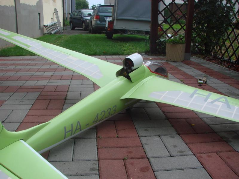 No i kolejna Mucha w skali 1:4 3,75m. Model cało drewniany z zestawu OLDGLIDERS, przygotowana pod napęd elektryczny. Zmiany polegają na zastąpieniu nosa drewnianego,nosem laminatowym który jest demontowalny, co w znacznym stopniu ułatwia montaż silnika i elementów przedłużających jego oś. Do napędu tego modelu użyto silnika Hacker A50, regulatora 70A oraz pakietu 5 cellowego. Na doważenie włożyłem około 200 gram ołowiu. Niebawem będą zdjęcia zelektryfikowanego Nietoperza i Bociana w skali 1:4.
