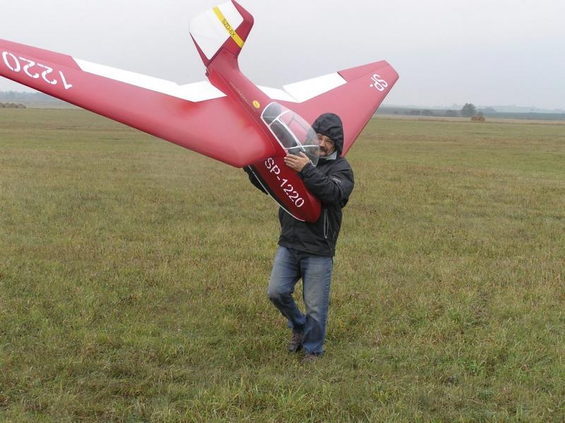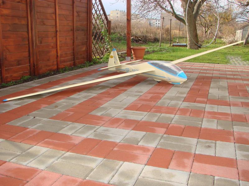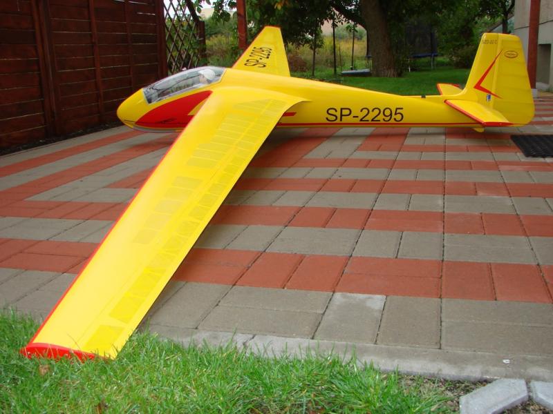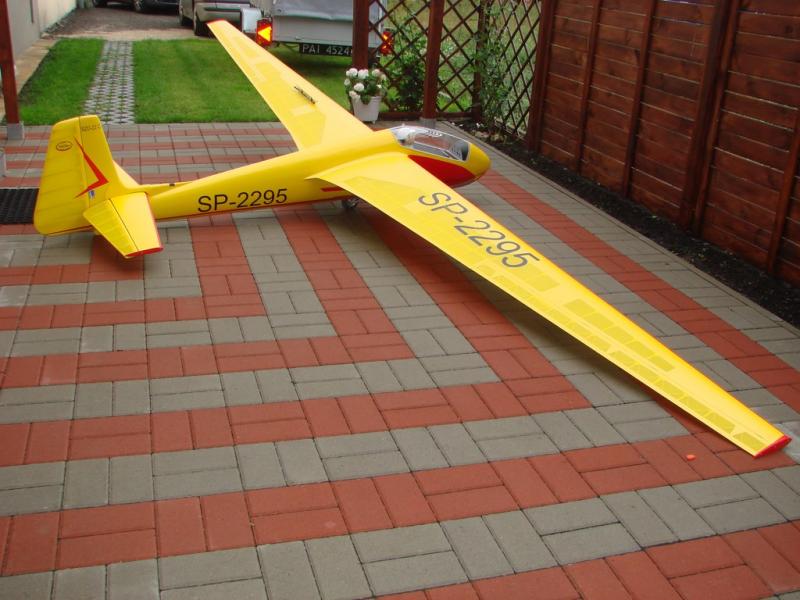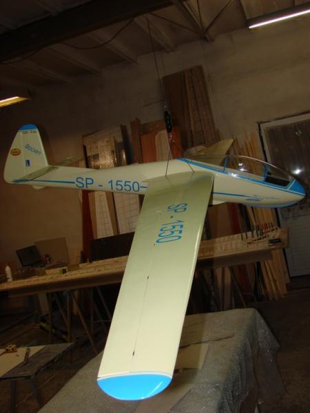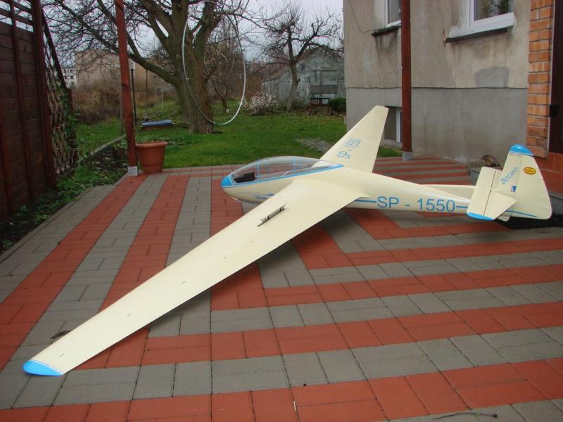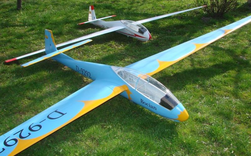 1. Końcówki skrzydeł. Z tego co pamiętam już był temat poruszany, ale napiszę jeszcze raz. Każdy nasz klient niezależnie czy to będzie z Polski czy z zagranicy otrzymuje do zestawu KIT komplet dokumentacji, która pozwoli na zbudowanie modelu jak również na prawidłowe ukształtowanie końcówek skrzydeł tudzież stateczników czy innych rzeczy. 2. Wznios. Nie wiem skąd informacja, że ten model nie ma wzniosu (dziwnie wygląda w locie). Model ma wznios skrzydeł między 1,5 a 2 stopnie. W locie podnosi skrzydła do około 3-4 stopni. W większości przypadków a już na pewno w tym jednym, patrzymy na sprawy modelarskie z innej perspektywy. Ja jako producent, modelarz jako modelarz.Wykonując zlecenie projektu dla dużego odbiorcy dostaje od niego nakreślone założenia które musi spełnić produkt. Nie zawsze zatem model zrobiony jest zgodnie z oryginałem bo widocznie dla odbiorcy nie to jest najważniejsze. Parametry techniczne tego Bociana były liczone w znanym Instytucie Europejskim i wykonany został zgodnie z jego instrukcją. Tak zatem sugestie modelarzy abym zmienił wznios bo będzie ładniej wyglądał i miał coś lepsze albo coś gorsze w tym przypadku niestety nie mogą być uwzględnione. Przepraszam wszystkich tych, według których ten model nie spełnia ich oczekiwań. Właśnie zostały zakończone prace przy modelu SZD-9 Bocian 1e 1:5. Pusty model waży 2,8kg. Jeszcze jedno zdjęcie SZD-9 Bocian 1:5 w towarzystwie SZD-9 Bocian 1:4