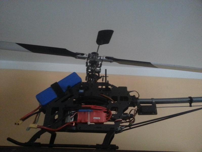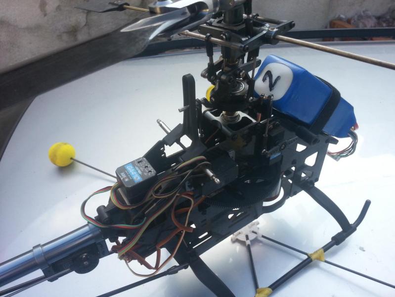 W heli zamontowane jest silnik Turnigy 1600KV, żyroskop Futaba GY401, aparatura SPECTRUM DX6i,do tego posiadam do nauki latania Aerofly 5.