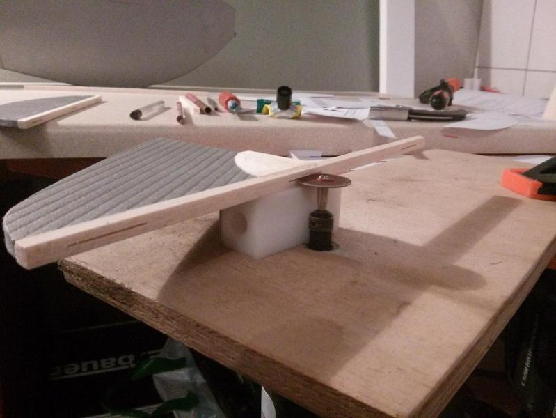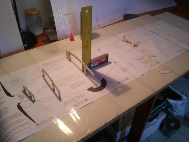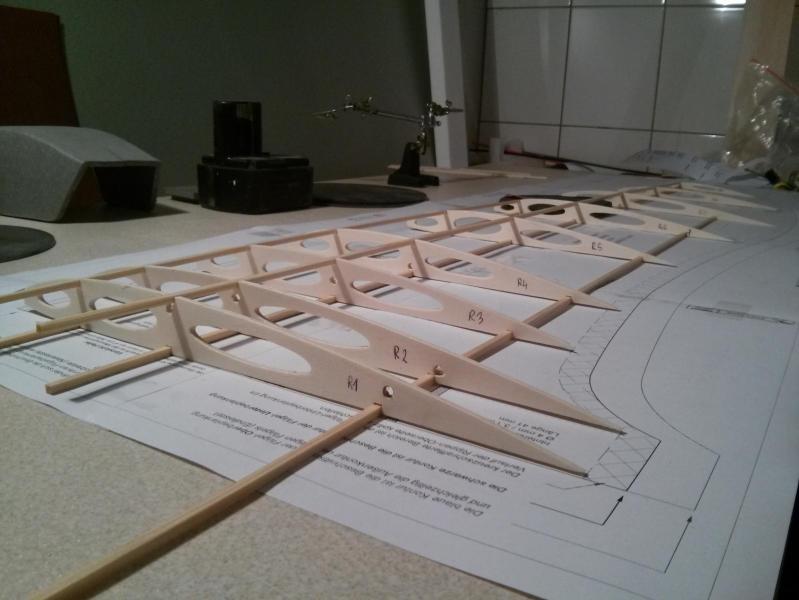 Witam , jak w temacie miało nie być ale jest . Budowę zacząłem już jakiś czas temu, ale co rusz mam jakieś pytania wiec stwierdziłem że prościej będzie zrobić relacje z budowy i tutaj pytać.Model który buduje to Hibou motoszybowiec (Oldtimer) ,podkładowo - depronowy . Rozpiętość 2050 mm Długość 1200 mm Profil Clark-Y mod. Sterowanie kierunek i wysokość . Waga 900-1200 g (zobaczymy jak będzie) Tak wygląda zbudowany przez kogoś kto się na tym zna Zacząłem od wycinania części kadłuba , miało być ze sklejki topolowej 4 mm a zostało zrobione ze sklejki brzozowej 3 mm . Plan przewiduje że powstanie on z dwóch połówek i tak też go robiłem ustawiając i mocując do planu na CA . Całość należało okleić depronem 6 mm ,ale okleiłem tym co było pod ręką .. podkłady 6 mm (potem żałowałem ) Druga połowa wyszła lepiej , koledzy doradzili żeby listwy sosnowe 3x3 moczyć i nadać im odpowiedni kształt przed wklejeniem we wręgi kadłuba . Pomimo że pierwsza połowa nie miała wielkich naprężeń to druga leżała zdecydowanie lepiej na stole Oklejoną całość udało się na próbę połączyć na taśmie klejącej . Schody zaczęły się w monecie gdy chciałem skleić dwie połowy ..... masakra . Podkłady wysmarowane UHU POR a jak wiemy on nie wybacza błędów, a zostaje jeszcze spasowanie wręg kadłuba .... jak by tego nie było dosyć ster wysokości jest dzielony wiec musiałem wkleić Bowden x2 i przeciągnąć go na lewą i prawą stronę kadłuba . C.D.N. Budowa jest posunięta dalej wiec wrzucę znowu hurtem. Całość dała się skleić, ale nie polecam smarować wszystkiego klejem jak leci . Ja kleiłem na trzy razy i moim zdaniem tylko tak można to ogarnąć . Na zdjęciu wstępnie pod szlifowany i wycięta kabina . Czas na stery tu poszło gładko . Zostało zabrać się za dalsze wycinane . Wydrukowałem , nakleiłem i wyciąłem żebra na jedną połowe skrzydła (posłuchałem Rafała i dałem sobie spokój ze sklejką brzozową ) ... wyszło całkiem nieźle . Druga połowa miała być analogicznie ale coś poszło nie tak , zaznaczyłem niechcący przy drukowaniu sam nie wiem co i oczywiście nie zauważyłem tego , w konsekwencji wyciąłem , oszlifowałem , dopieściłem i wyrzuciłem cały komplet . Okazało się że nie ma w planach drugiej polowy skrzydła ... co u mnie spowodowało już panikę i paraliż prac ,ale przerysowałem na kalkę techniczną i wyszły nawet dosyć podobne Na pokrycie skrzydła użyłem depronu 3mm , fajny materiał . Skrzydło powoli oklejam i zamykam . Dorobiłem też krawędź natarcia z balsy i brakło kleju... wiec to by było na tyle . Teraz pewnie pójdzie wolniej z relacją ale mam nadzieje że dobrnę do końca !! I jeszcze przymiarka do FunCuba .
