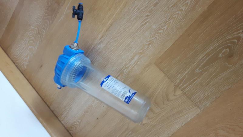 Jako bufora używam obudowy filtra do wody 10 cali. Pojemność mniej więcej półtora litra. Można wrzucić wkład filtrujący 5 mikronów, nawet bez niego zassie pół litra żywicy bez szkody dla pompy bo działa jak dostojnik. Ciśnienie pracy do 8 bar. Mój pochodzi z demontażu.