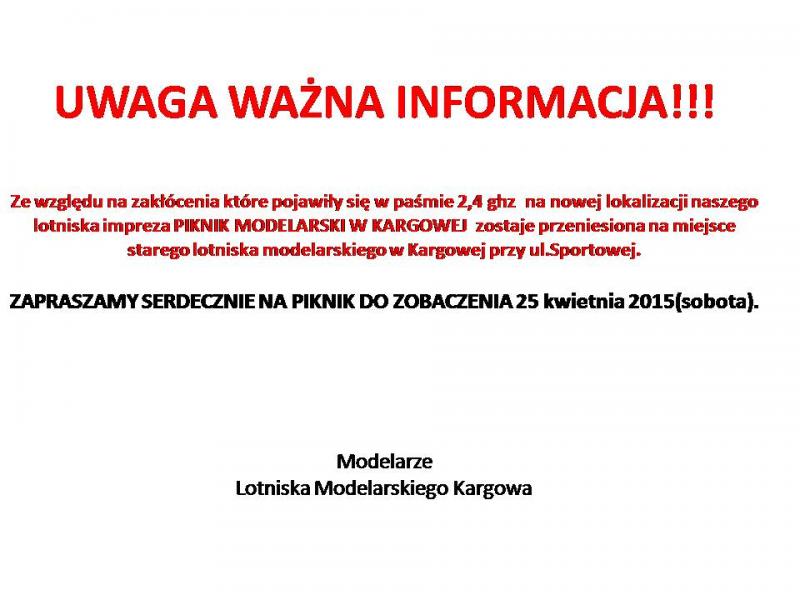 Wszystkich chetnych modelarzy zapraszamy na impreze: PIKNIK MODELARSKI KARGOWA 2015 Link do imprezy na stronie Facebooka: Lotniska Modelarskiego z Kargowej : https://www.facebook.com/events/465574886929434/ PIKNIK MODELARSKI W KARGOWEJ 2015 Będzie to już trzecia impreza pod tytułem Piknik Modelarski ale zarazem pierwsza na nowym już prywatnym terenie Lotniska Modelarskiego w Kargowej. Lotnisko zlokalizowane jest jadąc z Kargowej w kierunku Sulechowa/Zielonej Góry drogą nr 32/ za boiskiem sportowym po lewej stronie. Dokładna lokalizacja na profilu fb : https://www.facebook.com/LotniskoRCKargowa?ref=hl 25 kwietnia(sobota) 2015 o godz.10:00 (teren za stadionem sportowym) Szybowce,motoszybowce,elektryki,spaliny,pokazy akrobacji 3d i f3a,drony,fpv,wystawa modeli ,zawody na celność lądowania i inne atrakcje związane z modelarstwem. Organizator: Modelarze działający przy Lotnisku Modelarskim w Kargowej Dla każdego modelarza darmowy poczęstunek od chłopaków z Lotnisko Modelarskie Kargowa. ZAPRASZAMY !!!!!!!!!!!!
