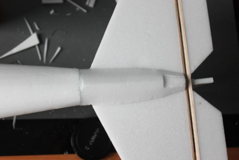 Dziękuję za poradę. Żeby cokolwiek zrobić z tym tyłem, musiałem wzmocnić podpory skrzydeł, bo zaginały się do wewnątrz przy próbie obłożenia ich czymś. Następnie spróbowałem z tym papierem, ale trochę mi nie szło, więc od razu przeszedłem na depron. Tu się bardzo przydały porady Pana Roberta, co do zaginania depronu i chyba mi całkiem wyszło: