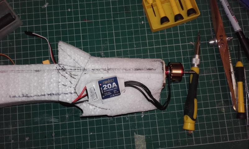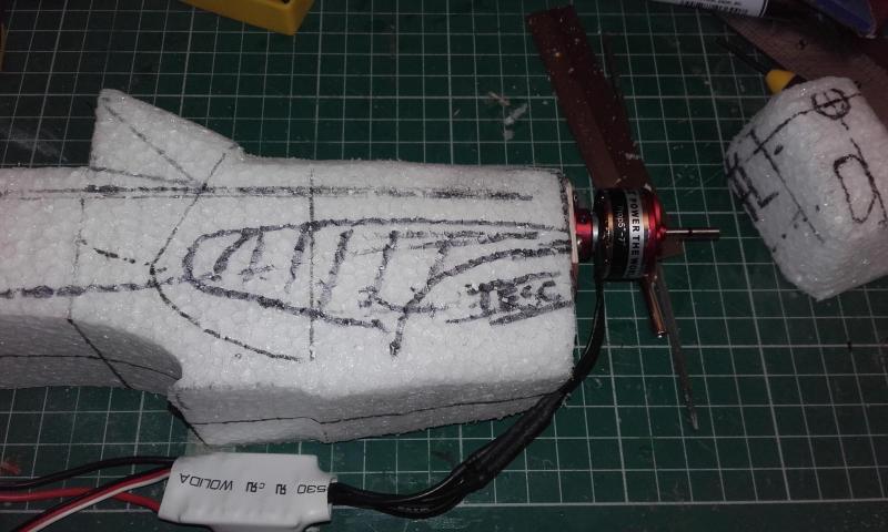 Wczoraj zamocowałem silnik. Najpierw obciąłem nosek, oj bolało. Całe 40mm odpadło. [attachment=90620:20160324_232855.jpg] Przykleiłem wręgę z silnikiem pamiętając o skłonie i wykłonie. Jakby był za duży lub mały to zawsze można zrobić lekką poprawkę. [attachment=90621:20160324_235105.jpg] ESC będzie ukryty pod maską, na zdjęciu to słabo widać ale dziób został po prawej stronie mocno powycinany w celu stworzenia kanału przelotowego dla powietrza. Więcej materiału nie podbiorę, silnik też musi się na czymś trzymać. [attachment=90622:20160325_003907.jpg] I po założeniu maski. Śmigło było tylko do przymiarki. [attachment=90623:20160325_003847.jpg] Dzisiaj planuję wklejać wzmocnienia węglowe.