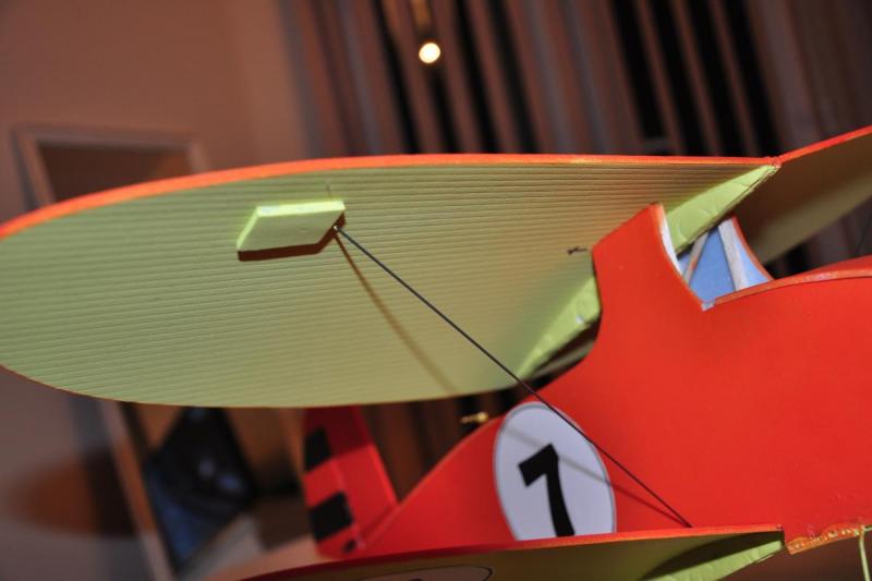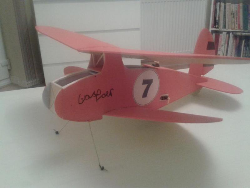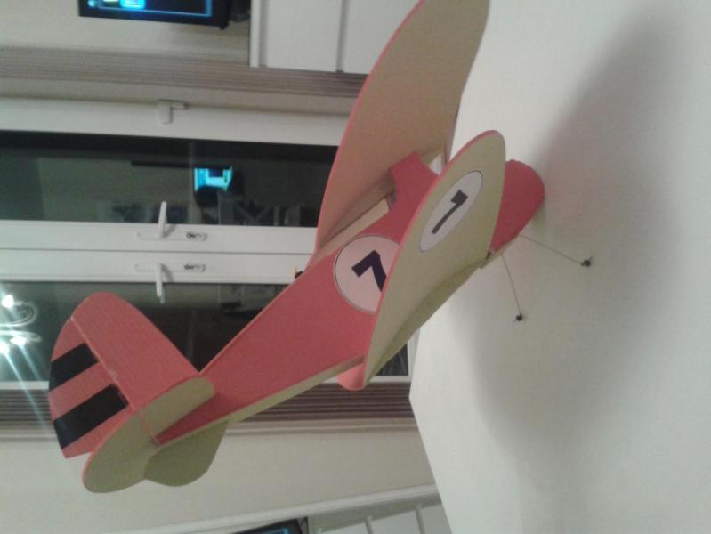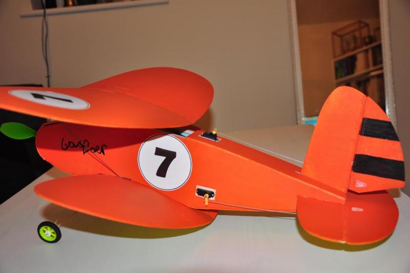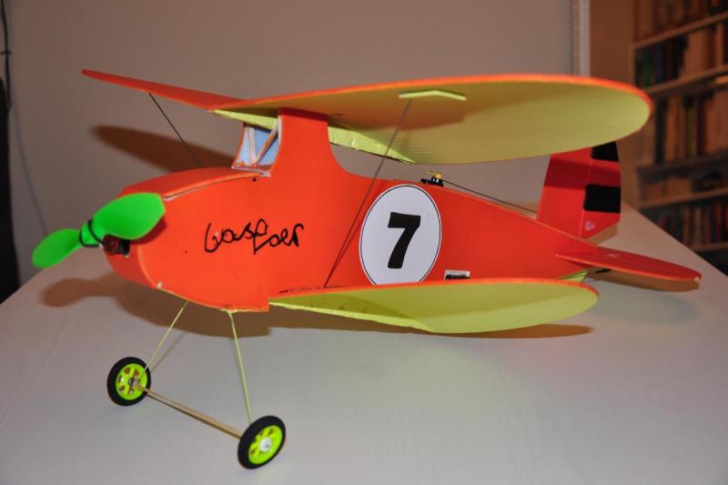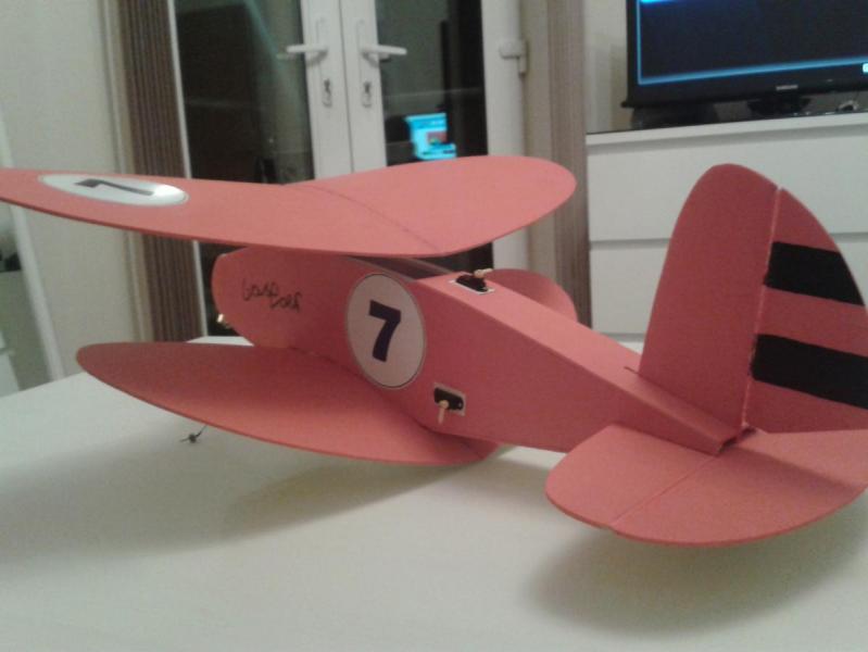 Na obecną chwilę samolot czeka na wyposażenie, koła i załogę :-). Zamontowałem serwa i skleiłem wszystko za wyjątkiem górnego płata. No tak została jeszcze maska silnika :-) W wersji na zdjęciach waży 85g jest szansa, że zmieszczę się w planowanej masie. Rozpiętość 560mm, długość 560mm. Proponowane przez autora wyposażenie to: Silnik:: 15 - 20 g outrunner; prototyp: Turnigy 2211/1700 http://www.hobbyking.com/hobbyking/store/__61496__Turnigy_2211_Brushless_Motor_1700kv_UK_Warehouse_.html Bateria: 2s 450 - 900 mAh Śmigło: 7 x 3 lub podobne; prototyp: Graupner 6,7 x 3,5 Wybrałem takie ESC: http://www.hobbyking.com/hobbyking/store/__29556__HobbyKing_6A_ESC_0_5A_UBEC_UK_Warehouse_.html Ten ma większy zapas do 10A http://www.hobbyking.com/hobbyking/store/__21247__HobbyKing_10A_ESC_1A_UBEC.html Nie mam dużego doświadczenia ale wydaje mi się, że to dobre wyposażenie. A tak wygląda samolot na obecną chwilę. Słaba jakość to wynik kiepskiego światła :-( Przyszły pilot już się na nim podpisał :-) -