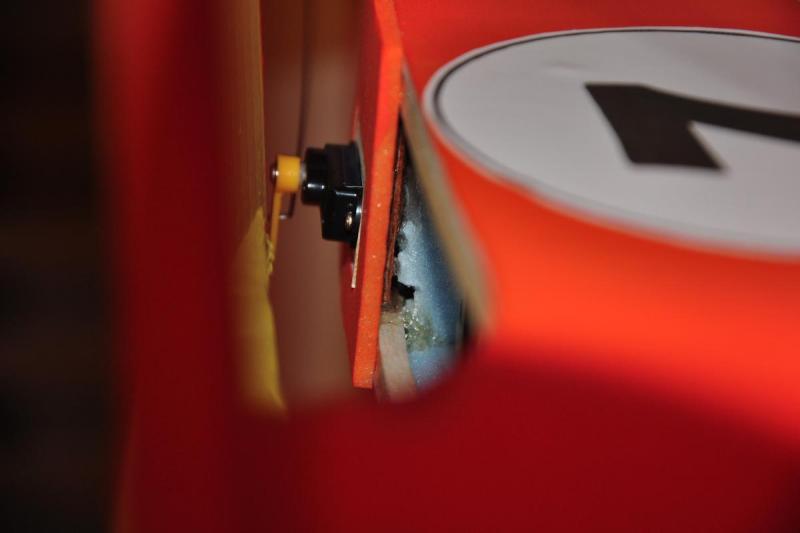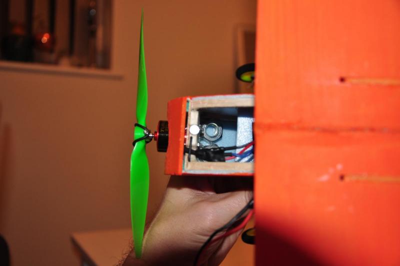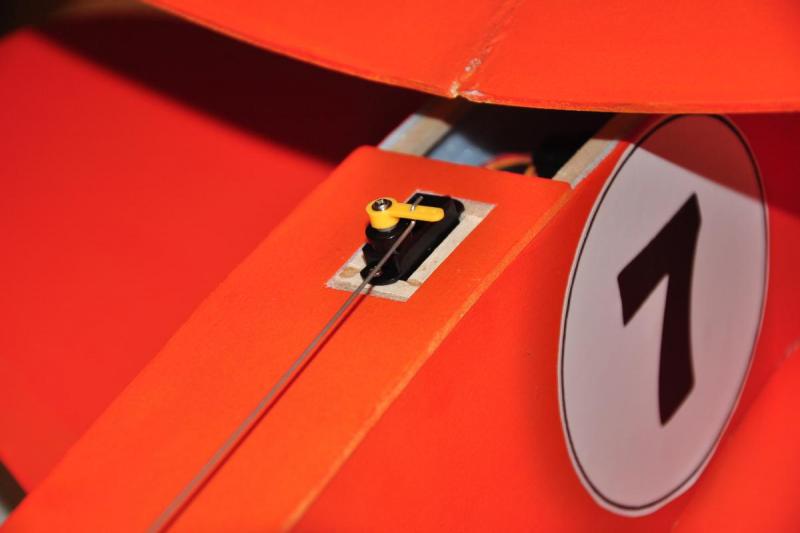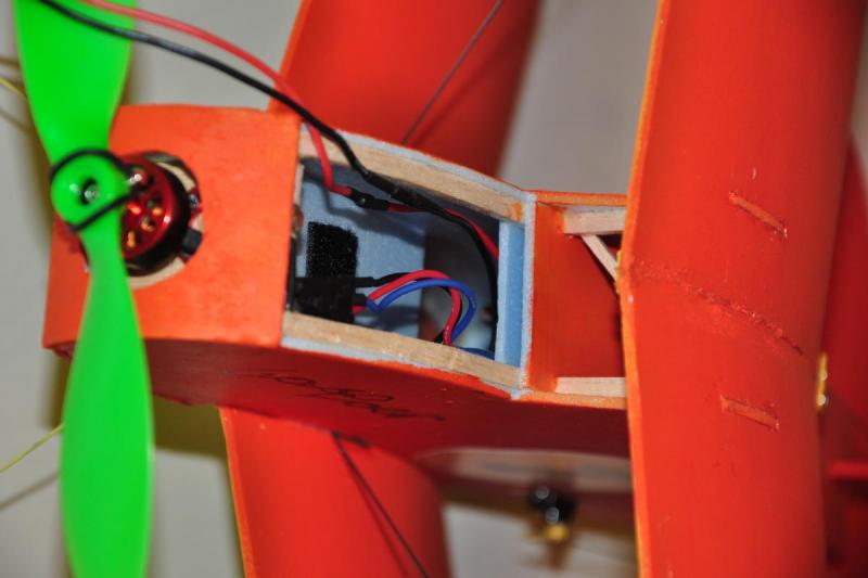 Model skończony, wyważony i gotowy do lotu. Niestety w trakcie wyważania okazało się, że ogon jest zbyt ciężki a dziób za krótki i musiałem dołożyć masy. Przytyło mu się o 20g i wyszło łącznie 200g. Podwozie "amortyzowane" gumą :-) Właściwie guma trzyma, żeby się koła nie rozjeżdżały. Wybrane podzespoły: Silnik: Turnigy 2211 Brushless Motor 1700kv, http://www.hobbyking.com/hobbyking/store/__61496__Turnigy_2211_Brushless_Motor_1700kv_UK_Warehouse_.html Regulator: HobbyKing 10A ESC 1A UBEC, http://www.hobbyking.com/hobbyking/store/__29550__HobbyKing_10A_ESC_1A_UBEC_UK_Warehouse_.html Bateria: Turnigy nano-tech 460mah 2S 25~40C Lipo Pack, http://www.hobbyking.com/hobbyking/store/__28450__Turnigy_nano_tech_460mah_2S_25_40C_Lipo_Pack_UK_Warehouse_.html Serwa: Turnigy 1370A Servo 3.7g/0.4kg/.10sec, http://www.hobbyking.com/hobbyking/store/__29315__Turnigy_1370A_Servo_3_7g_0_4kg_10sec_UK_Warehouse_.html Śmigło: 7x3.8 Turnigy Slow Fly Electric Prop Green, http://www.hobbyking.com/hobbyking/store/__60393__7x3_8_Turnigy_Slow_Fly_Electric_Prop_Green_4pc_UK_Warehouse_.html Dodatki (Snapy): http://www.hobbyking.com/hobbyking/store/__52031__Mini_Accessory_Pack_with_2_x_Horns_2_x_Hinges_2_x_Wheel_Collets_and_2_x_Clevis_Joints.html Bateria montowana będzie na półce, plany zakładały mocowanie baterii na dnie kadłuba ale musiałbym zbudować dolną klapkę lub mieć dłuuuugie palce :-) Serwa zamontowane na "szufladkach" z balsowej listwy i całość przyklejona na półce ze sklejki. Jeżeli chodzi o snapy to ponownie wykorzystałem snapy, sprawdzone już w patyczaku i zakupione w hobbyking. Wspomniane dodatkowe 20 gram oraz widoczny magnes (mała okrągła pastylka) do mocowania pokrywy baterii. Zastrzał skrzydła. Model gotowy do lotu, czeka tylko na dobrą pogodę, a taka w Anglii to może dopiero na wiosnę. Ale film z oblotu będzie. -
