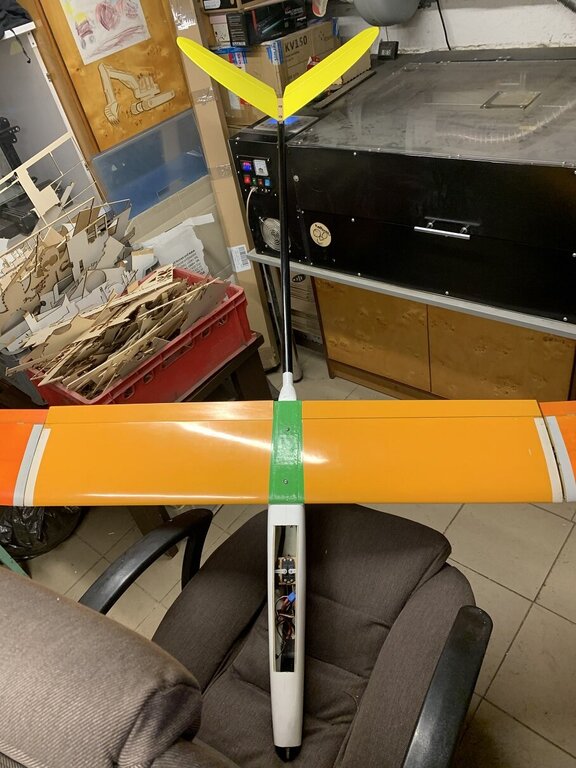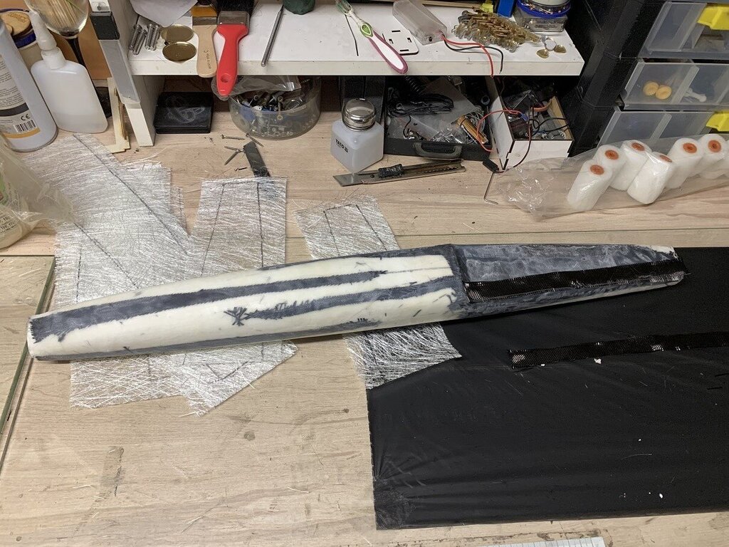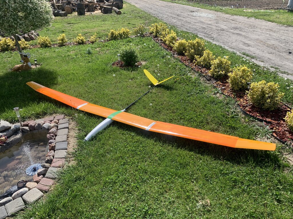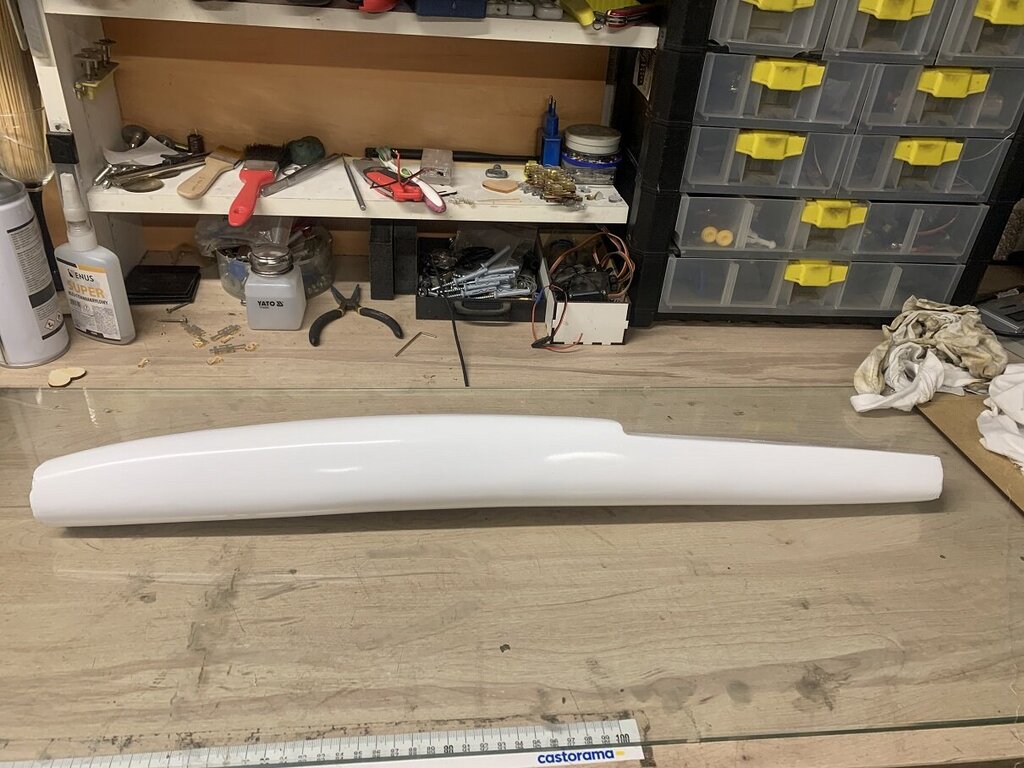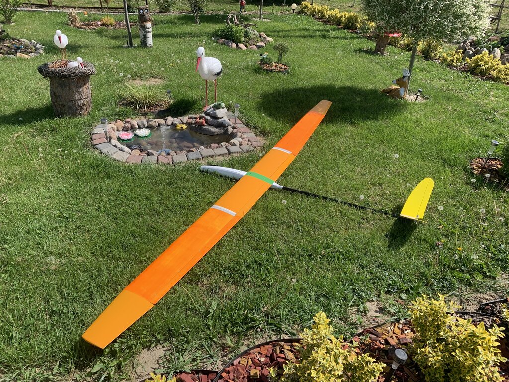 22. Model coraz bliżej ku końcowi, czekam na bowdeny 1,5m, z czego jestem najbardziej zadowolony zrobiłem przymiarkę i na szybko wyważenie, jak dojdą bowdeny to wyważenie będzie idealne bez dokładania balastu, gdzie przy poprzednim kadłubie było ok 280g, zobaczymy na końcu wagę całości, poczekamy na warunki bo obecnie wieje do 15m/s i ma być tak przez ok 2 tyg. Model poleci, jak poleci i będzie ok to robię model następny cały z węgla łącznie z płatem.