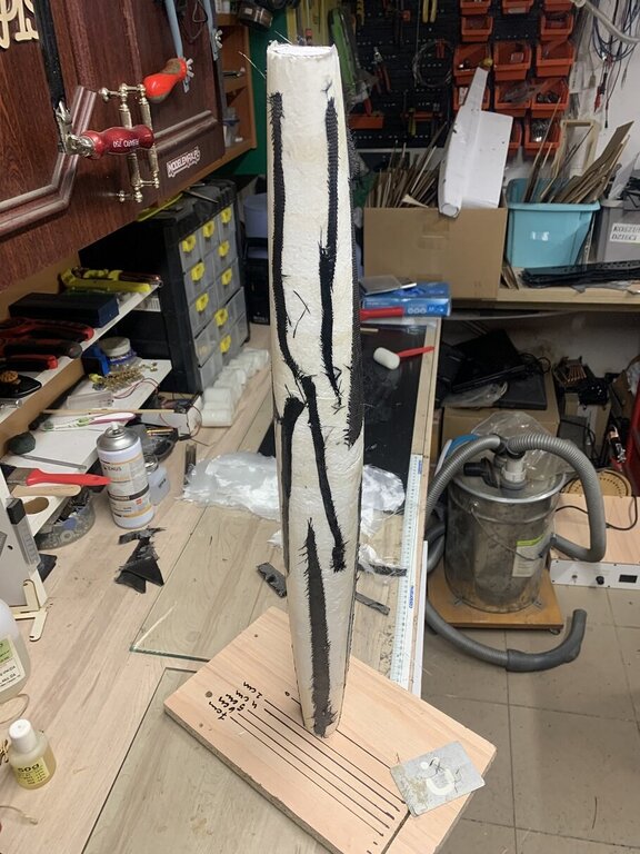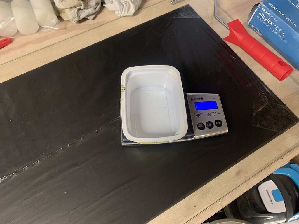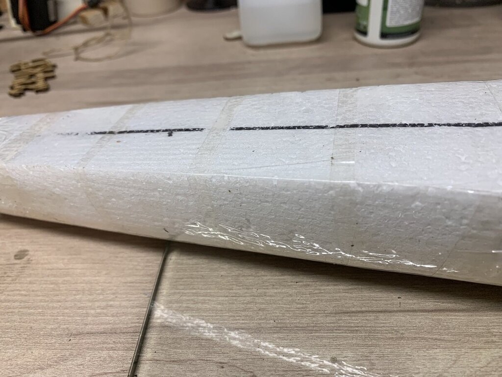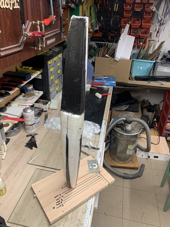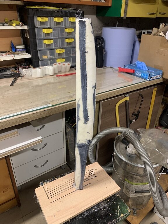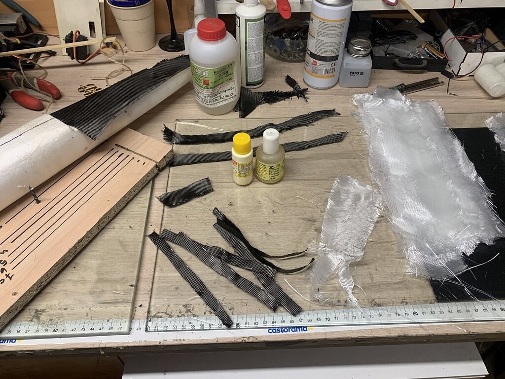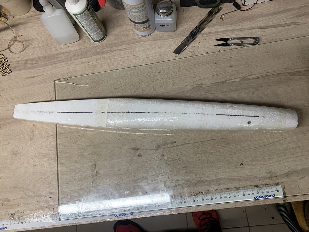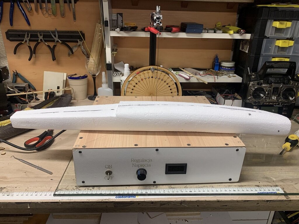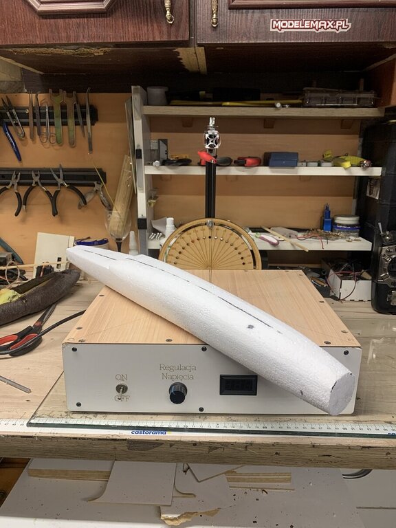 Witajcie po namowie kolegi forumowego Aresa postanowiłem pierwszy raz zrobić laminowany kadłub. Proszę nie linczować jak coś źle robię proszę o podpowiedź co poprawić, a następny będzie już dużo lepszy. Na pierwszy ogień poszła wycinarka do styropianu zrobiłem z tego co było pod ręką działa bez problemu. Później wymyśliłem sobie kształt kadłuba laserem wyciąłem szablony kadłuba, i w styropianie wyszlifowałem styropian, i okleiłem taśmą. Jako rozdzielacza użyłem wosku do samochodu, czy działa nie wiem ale posmarowałem. Przygotowałem matę i resztki węgla, które miałem. Mata 80g nic innego nie posiadałem, epidan 53. Stanowisko do żywicowania. No i się zaczęło, na pierwszy ogień poszły resztki węgla, i na to pierwsza warstwa maty w sumie położyłem 3, i zastanawiam się czy nie za mało, dziś podjadę i kupię w sklepie z lakierami matę grubszą i położę jeszcze 1 warstwę ok 300g i jeszcze jedną 80g co myślicie o tym. Jak na pierwszy raz wydaje się, że wyszło całkiem ok, nakładałem mały kawałkami, zastanawiam się tylko o sztywność czy nie będzie za słabo, proszę o poradę czy dokładać i ile.