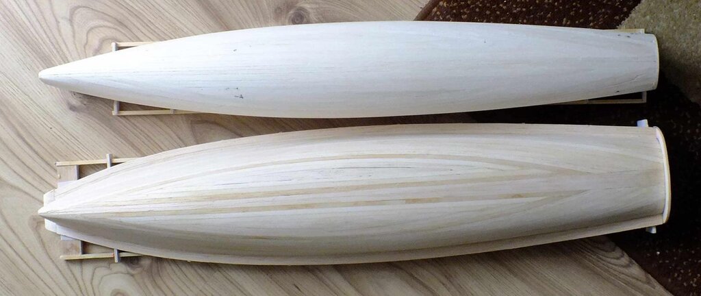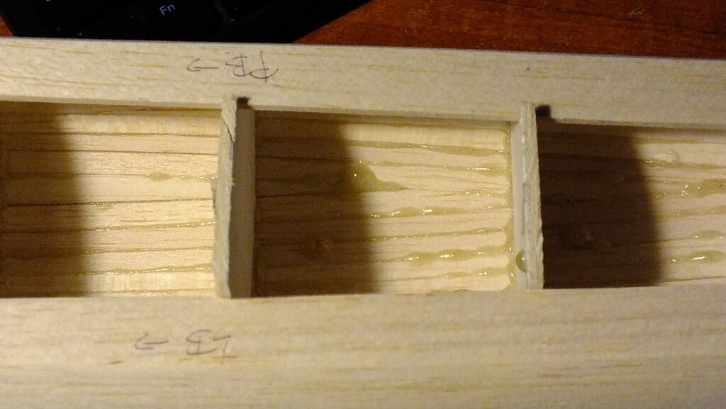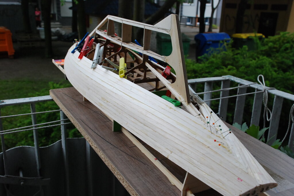 Listewki najlepiej wykąp w bejcy, wtedy pigment głęboko wejdzie w materiał. Bejce to albo spirytusowe, albo nitro i jedne i drugie są dostępne. I klejenie. Bardzo lubię poliuretanowego Soudala, ale ma jedną wadę. Nie przeszkadza mi wtedy kiedy jest to zamknięty kadłub, ale w wypadku OMEGI z dużą ilością widocznego kadłuba od środka raczej bym kleił epidianem. Po przyklejenieu trzeba wewnątrz wycierać lub rozcierać nadmiar żywicy. Soudal ładnie się pieni, uszczelniając jednocześnie styk listewk poszycia, ale usunięcie wewnątrz kadłuba spienionych wypływek kleju jest uciążliwe. Tak to mniej więcej wygląda w naturze.