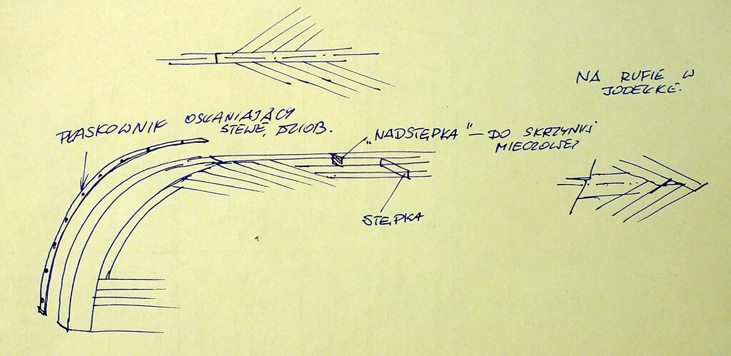 Spróbuję pomóc. Przy w sumie niewielkim sterze, zresztą różniącym się kształtem i powierzchnią od odwzorowanego w skali urządzenia sterowego (głównie płetwy) możesz to zrobić w sposób następujący. Ale po kolei. Równoległość orczyków pozwala w prosty sposób uzyskać odwzrowanie ruchu serwa poprzez urządzenie sterowe. Nie musisz nic kombinować w aparaturze. Nie upierałbym się przy napędzie dwustronnym. Narysowałeś duży orczyk. Na rysunku widać, że masz niesymetryczne wychylenia dźwigni dla uzyskania jednakowych wychyleń steru. Gdyby zaczep dźwigni był równoległy to nie byłoby tej asymetrii, na dokładkę dla typowego dla serw wychylenia (najczęściej +/-45 wykorzystujesz drobny fragment zakresu. Jeżeli zrobisz dwa cięgna przy tym co masz to będzie występowała zmiana jego długości (ciegno nie zmieni długości tylko się wyboczy) Uniósł bym rumpel lub rogatnicę trochę do góry tak żeby maskowała dźwignię, zrobił tuż na linią pokładu dźwignię jednostronną i podobną dźwignię założył do serwa. Długość 20-25 mm, zaczep na dźwigni serwa 15-20 mm. To zapewni odpowiednie wychylenia steru. Zresztą obie dźwignie mogą mieć kilka otworów i wtedy po próbach można ustalić wlasciwe położenie. Napęd bowdenem M2 Lub M3, odpowiednie snapy i po kłopocie. Dziurawienie pawęźy nie jest najszczęślliwszym pomysłem, bowden daje szczelne wyprowadzenie napędu z kadłuba a to jest dosyć ważne. Na dokładkę napinacz achtersztagu będzie to wszystko maskował. Można to też rozwiązać miękkimi linkami, ale wtedy trzeba zrobić dźwignię dwuramienną i wprowadzić element napinający całość, np sprężynką , do linek. Na rysunku proponowane rozwiązanie.