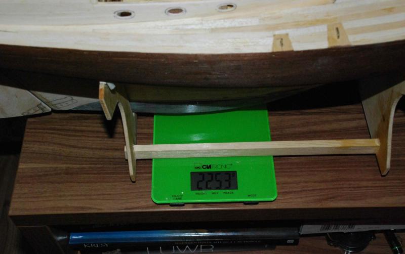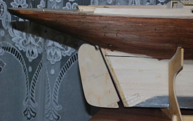 Skleiłem płetwę steru i dopasowałem ją do kadłuba, podcięcie w dole to miejsce na dolny zawias . Dobra wiadomość, to aktualna masa jachtu. Na resztę, czyli wyposażenie, takielunek i wykończenie kadłuba mam co najmniej 900 g. Zakładana całkowita masa to około 3150 g, wtedy jacht siądzie na swojej KLW. Jacht jest na tym etapie lżejszy niż przewidywałem i z tego jestem bardzo zadowolony. -