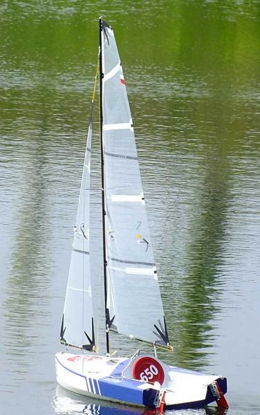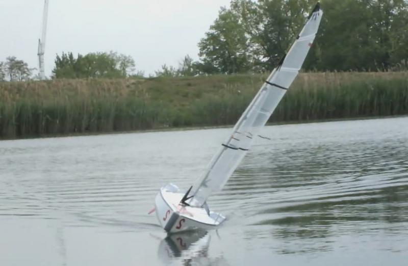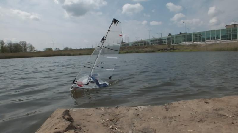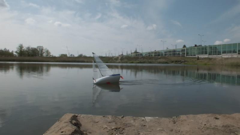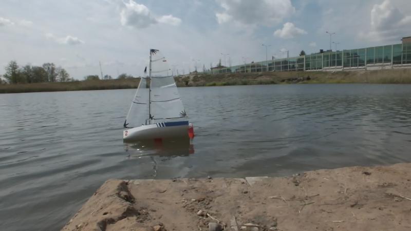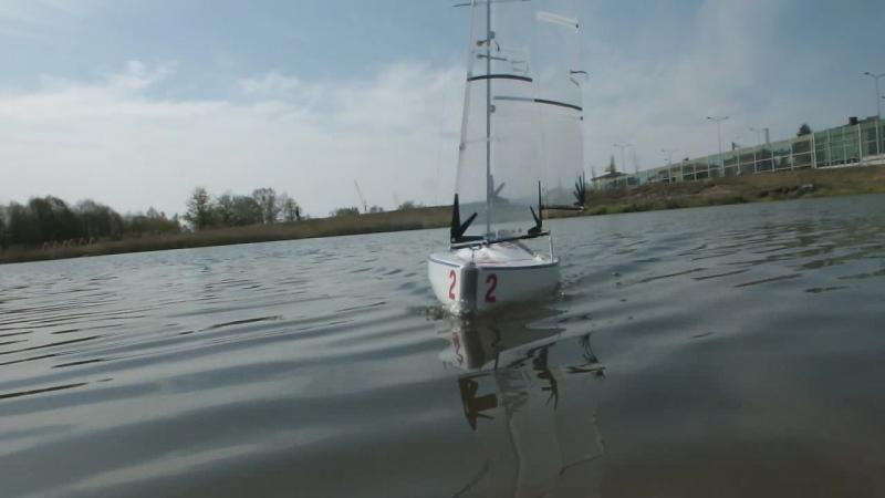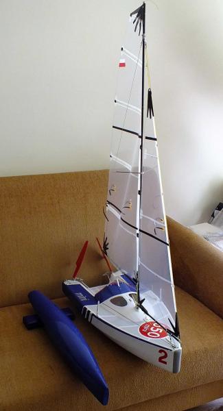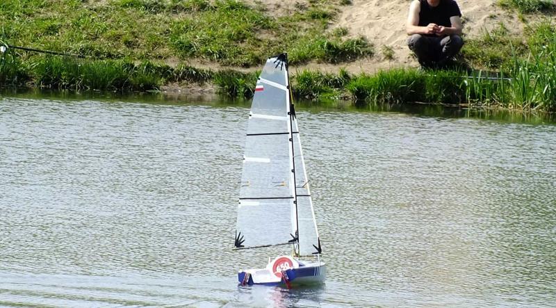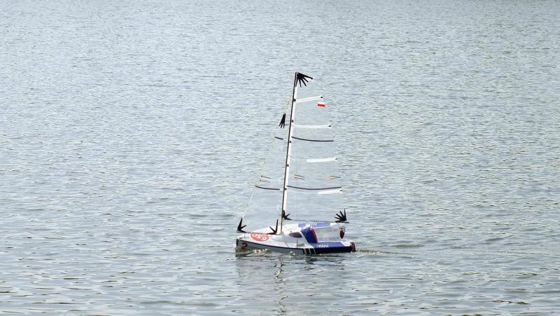 Dziękuję i cieszę się że ten model pomimo "garbatej" sylwetki może się komuś podobać. Czas na małe podsumowanie wrażeń i parę uwag po pierwszym pływaniu. - zrównoważenie dobre, może na następne pływanie przesunę top masztu do przodu (~ 10 mm), przy dużych przechyłach daje się odczuć trochę mniejsza powierzchnia sterów. - niewielkiej korekty wymagalo: położenie sterów - tu wystarczyła lekka korekta trymerem, widocznie krzywo ustawiłem coś w domu. - listwy w żaglach (od góry), 2 i 3 są trochę za sztywne i czasem po zwrocie grot potrzebuje trochę czasu na złapanie odpowiedniego i po odpowiedniej stronie wybrzuszenia. - chyba zrobię nową kipę szotów grota z otworem przesunietym do tyłu - `10 mm. - ściagacz regulujący szoty foka pomimo dodatkowego przeplecenia puszcza, chyba za mocno wygładziłem otwory, zrobię nowy. Ściągacz grota trzyma bardzo dobrze. - nie było dużej fali, ale jacht żegluje sucho. W środku nic nie stwierdziłem. Zmiana luku dostępowego i wykorzystanie do tego celu pokrywki po kawie - bardzo wygodna. Kilka zdjęć (ramki z filmu HD, jakość nie powala, ale dla mnie mają charakter poglądowy. Widać zachowanie jachtu przy większym przechyle. Jacht nie topi dziobu. Niby to wszystko liczyłem, wiem jak powinien zmieniac się trym podłużny ale potwierdzenie tego w doświadczeniu daje satysfakcję.