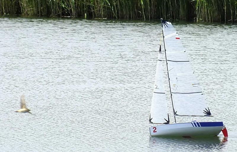 To co już zauważyłem , to to, że ten kadłub generuje trochę mniejszą falę niż pierwsze MINI. Pełniejszy dziób powoduje, że nie ma przy przechyle wsadzenia go do wody. Tym chyba zasłynęli dwaj nasi "wybitni" konstruktorzy, zwolennicy ostrego wejścia linii wodnych. Teraz gdybym projektował kolejne MINI zmieniłbym tylko jedną rzecz, w rzucie z boku zakrągliłbym bardziej przejście stewy w stępkę, nawet za cenę skrócenia wodnicy. Układanie się w przechyle jachtu ładnie widać na tym zdjęciu z jaskółką. Teraz czekam na troszeczkę silniejszy wiatr i mam nadzieję, że na nowych już żaglach łódeczka zacznie się podślizgiwać.