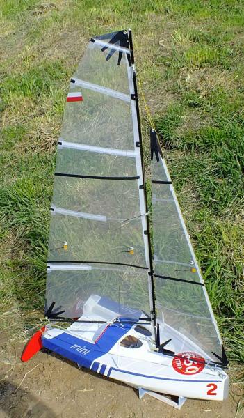 Dziobnica może być szersza, ale nie tu jest problem, jacht gdy płynie prawie prosto, wytwarza kawałeczek brzydkiej fali dziobowej (to ładnie widać na zdjęciu), myślę, że zaokrąglenie przejścia stewy w stępkę np. promieniem około 25 mm by pomogło. To dotyczy trochę większych prędkości, przy małych wszystko się ładnie uklada. Przeróbka dziobnicy w tym modelu raczej już nie wchodzi w grę, jest teoretycznie możliwa, ale nie chciałbym rżnąć kadłuba i coś doklejać. Może w następnym modelu, jeżeli będzie następne MINI. Na razie nie planuję. Mam co prawda jeden sklejony kadłubek i tam pewnie poeksperymentuję w przyszłości ze skrzydełkami, ale to dosyć odległe plany. Czekam na stwardnienie gispu w formie kilu do El Draco, jutro mam zamiar skleić nowe żagle do MINI i może wyskoczę trochę popływać.