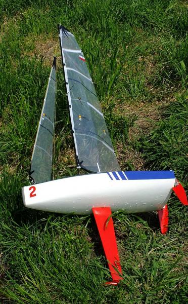 Troszeczkę popracowałem przy modelu. - zmienilem system regulacji długości szota foka i profilaktycznie również grota. - zmieniłem kipę szotów grota, cofnieta do tyłu reszta to zmiany regulacyjne: pochyliłem maszt około 15 mm do przodu, alternatywą byłby nowy większy fok, jest na to miejsce, ale to może póżniej zmieniłem profil grota, pogłębiłem do okolo 12%. Przeglądając zarejestrowane filmy na jednym z ujęć pokusiłem się o pomiar prędkości. Jak na pierwsze pływanie jest nieźle. Jachcik osiągnął ~0,9 m/s co odpowiada liczbie Froude'a Fn=0,356. To odpowiada sytuacji w której dolina fali dziobowej interferuje z wierzchołkiem fali rufowej. Model jest gotowy do następnych testów. Może jutro lub pojutrze znowu na wodę.