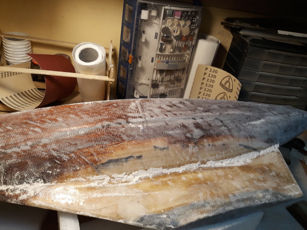 Pierwszy raz od blisko 2 m-cy odwiedziłem modelarnię. Wszystko OK. Przygotowuję kadłub "Dracenki" do żywicowania. Dlaczego nie lakierowania? Mniej więcej trzydzieci parę lat temu przygotowując belki kadłubowe do szybowców F1A po wyszlifowaniu nie lakierowaliśmy ich, tylko wcieraliśmy w oszlifowaną rurkę żywicę. Efekt dobry, ciężar mniejszy. W szybowcach miało to istotne znaczenie, a w "EL Draco'" raczej już nie. Jedną z zalet jest wręcz wzorcowe przyleganie żywicy do kadłuba. Nigdy nie spotkałem się z łuszczeniem sie powłoki. Dotyczy to tylko burt nad linią wodną. Poniżej wodnicy kadłub bedzie delikatnie szpachlowany i lakierowany tradycyjnie. Po trzech godzinach szlifowania jacht zaczął nabierać plynności na poszyciu. Jeszcze sporo pracy poniżej wodnicy, szczególnie w okolicach przejścia kadłub - płetwa balastowa. Efekty pracy na zdjęciach. -