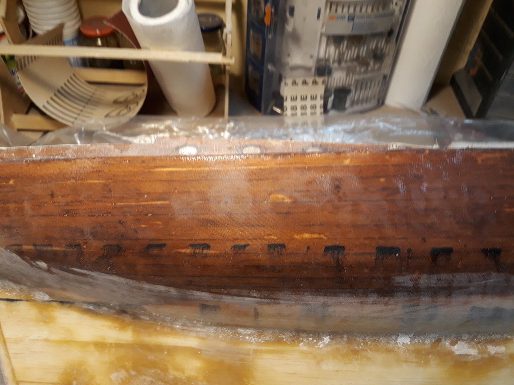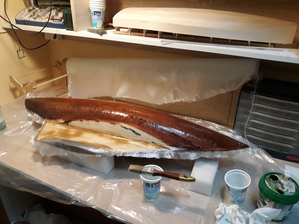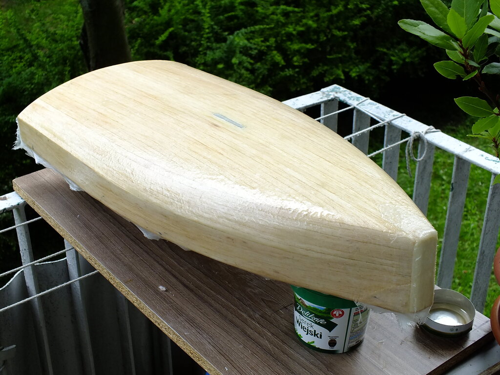 Zwróć uwagę na dwie sprawy. Te zdjęcie z Twojego postu pokazuje jak "liche" są wręgi w oryginalnej Omedze, to listewki dębowe (przynajmniej tak było w mojej obginane na gorąco na sklejonym kadłubie. Skorupka z balsy byłaby przy tej wielkości zdecydowanie za słaba i zbyt mało odporna na kontakt z przszkodami. Masa łódki będzie około 2kg, to dosyć sporo przy uderzeniu w cokolwiek. Powinieneś wzmocnić powierzchnię. Proponując sosnę miałem na uwadze nawiązanie do oryginalnego materiału i rozmiaru listew słomki. Oczywiście możesz zrobić to z balsy, ale wtedy laminat powinien być grubszy ( zbrojenie około 80-100 g/m^2). Nie wiedziałem, że chcesz odwozrować mahoń zrobiony z sosny. Ja coś podobnego zrobiłem w EL Draco. Tam doskonale widać klepki poszycia. I wtedy możesz spokojnie zastosować balsę. Da to dodatkową wyporność kadłuba. Podniesienie poziomu gretingów, ułozenie ich na wyższych dennikach pokrytych szczelną podłogą pozwoliłoby zrobić odpływowy kokpit. I wcale to nie wymaga otwartej rufy. Można zrobić odpływy gdzieś w okolicach skrzynki mieczowej ( tam chyba jest najniżej podloga o średnicy około 5 mm. W EL Draco zrobiłem odpływy mniejsze (2*3 mm) , ale objętość kokiptu w stosunku do wyporności jest tam zdecydowanie mniejsza. Skrzynka może zostać taka jaka jest, ewentualny finkil z bulbem może być dopasowany do niej. Laminat (cienki) zabezpieczy Ci poszycie lepiej niż jakikolwiek lakier, dodatkowo usztywniając powierzchnię. Żywica oczywiście epoksydowa, ma zdecydowanie lepszą adhezję do drewna niż poliestry. Lisewki poszycia możesz kleić albo na epoksyd, np E-53 albo na poliuretan np. SOUDAL 66A, wtedy trzeba uważać na wycieki kleju wewnątrz kadłuba. Usunięcie ich jest pracochłonne. Na zdjęciach kadlub MINI 650 i EL DRACO po polaminowaniu, W EL draco w części dennej są dwie warstwy AEROGLASU 80 g/m^2. W obu przypadkach doskonale widać klepki poszycia.