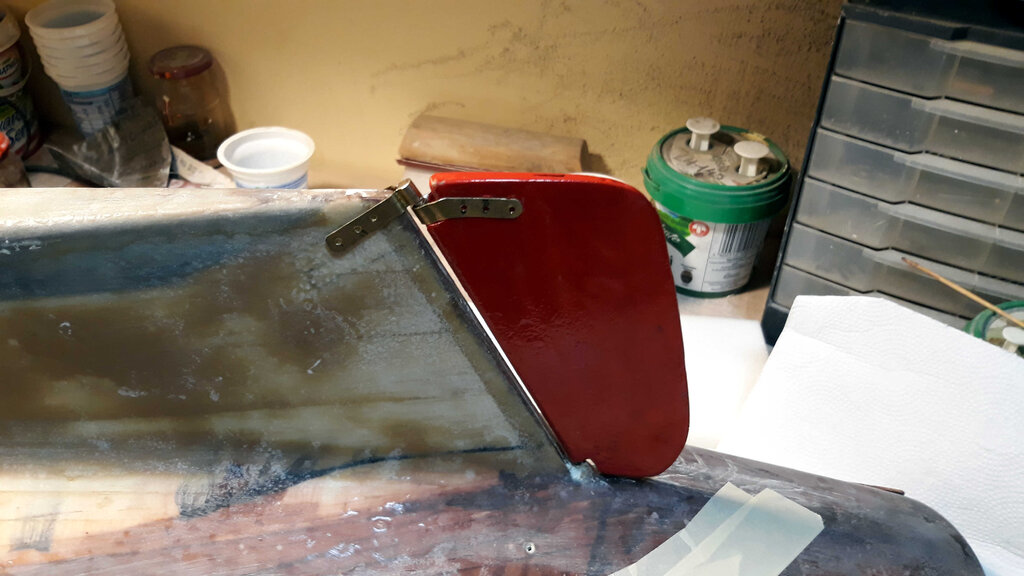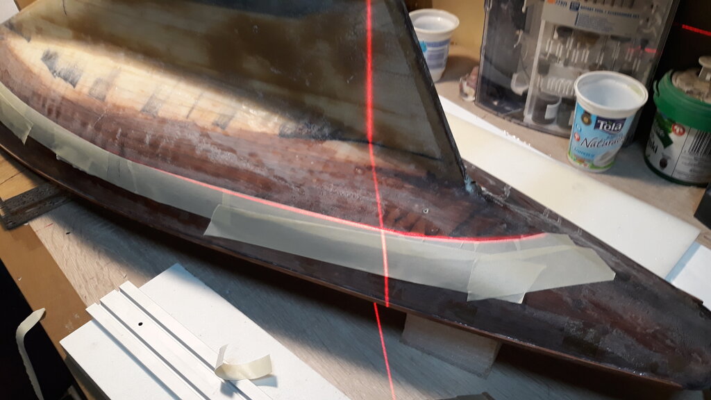 Ostatni mało pracowałem przy El Draco. Ale coś tam się dzieje. Zrobiłem dolny zawias steru i co najważniejsze położyłem pierwszą warstwę "antyporostówki". Malowanie podwodzia rozpoczałem od wytrasowania umownej wodnicy, rzeczywista będzie ( przynajmniej według obliczeń około 5 mm niżej. Laserowa poziomica bardzo ułatwiła zadanie. Taśma maskująca jest trochę za szeroka, ale rozciąłem ją na połowę, to uprościło oklejanie po kresce. Zaczyna to już jakoś wyglądać. Pomiędzy burtą a podwodziem będzie jeszcze biały pasek o szerokości kilku milimetrów. Farba raczej długo schnie ( jutro będę mógł się dotknąć). Początkowo miała być czerwień tlenkowa bardzo zbliżona kolorystycznie do prawdziwej antyporostówki, ale po próbie uznałem, że różnica kolorów pomiędzy dnem a burtami jest zbyt mała. Zdecydowałem się na "czerwień sygnałową" ostry czerwony kolor. Na zdjęciu wygląda jak pomarańcz, ale to zasługa kiepskiej barwy oświetlenia. Ledy źle oświetlają kolory czerwone. Na zdjęciu steru kolor jest lepiej oddany. -