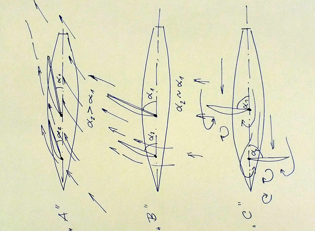 Może ten "gryzmoł" rozjaśni Ci trochę. Może przesadnie narysowałem odchylenie strug za fokiem na bajdewindzie, ale to oddaje istotę rzeczy i różnicę pomiędzy wychyleniami bomów. Ta różnica może zapewnić właściwy kat natarcia żagli. Przy półwietrze i baksztagach kąt pomię dzy bomami a osią jachtu powinien być podobny. Swoją drogą zastanawiam się dlaczego producent oznacza ten jacht jako kopię ETNZ. Równie dobrze można pomalować omegę na czarno, namalować kilka paprotek, dopisać to i owo i nadal będzie to omega a nie NZ. Warto porównać sylwetkę prawdziwego jachtu z modelem. Smukłość kadłuba, wyporność itd. bardzo się różnią. Wystarczy porównać wyporność oryginału i modelu. No cóż takie życie.Na zdjęciach NZ -84 i rysunek nowszego po kosmetycznych zmianach NZ-92.