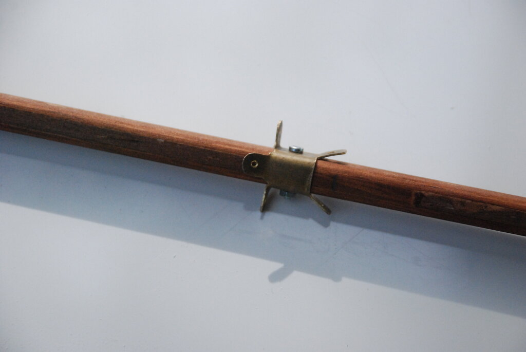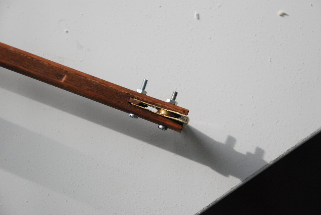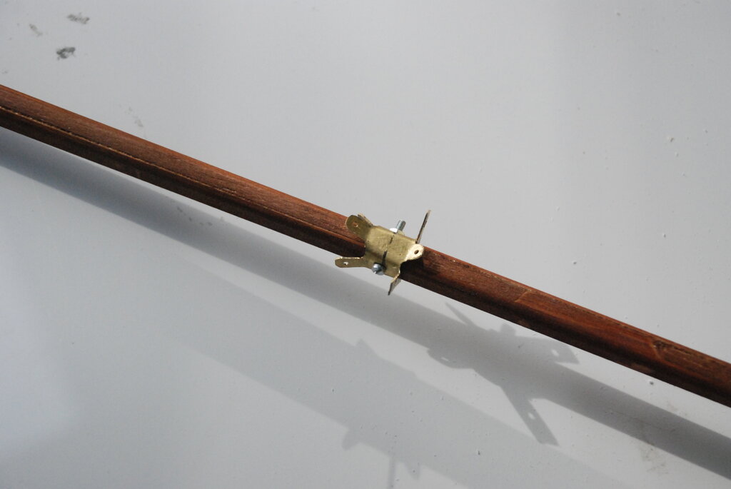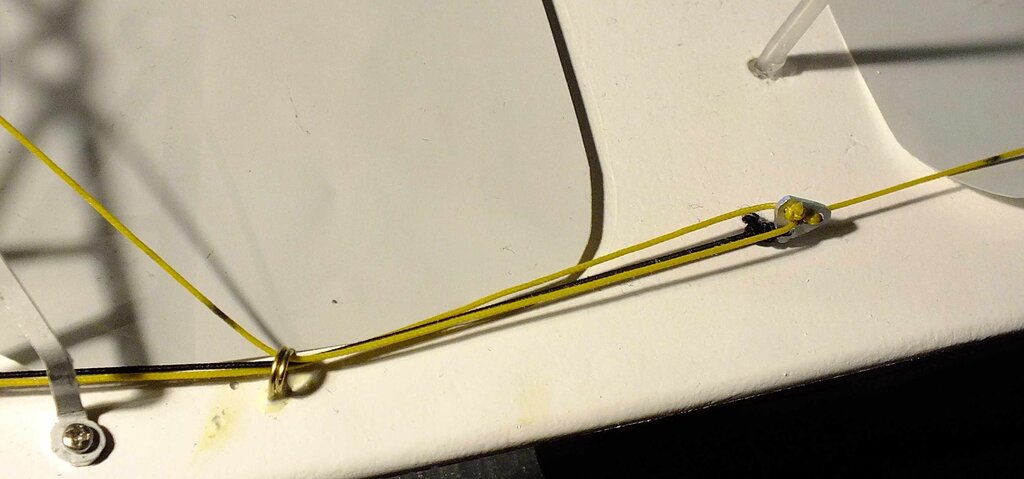 Małymi kroczkami do przodu. Na kadłubie namalowałem umowną wodnicę. Zdjęcie jest niestety poruszone, zrobiłem tylko jedno telefonem i jakość pozostawia niezwykle dużo do życzenia. Przepraszam za jakość. Jeszcze pozostaje nadanie soczystości burtom. Skończyłem okucia do grotmasztu. "El Draco" ma takielunek ułamkowy, sam maszt jest delikatny i podatny na gięcie. Aby to ograniczyć zastosowałem rozwiązanie znane z popularnej Omegi z jumpsalingami. One zapobiegają nadmiernemu wygięciu lub wręcz złamaniu górnej części masztu. Wanty i wanty kolumnowe dopełniają reszty usztywnień. W kogucie jest rolka fału grota, sam fał grota poddonnie jak fał foka, będzie knagowany w dolnej częsci masztu na jednej z dwóch knag. O ile wanty będą napinane normalnymi ściagaczami to jumpsztagi będą napinane specyficzną odmianą talrepa, coś pomiędzy napinaczem namiotowym a klasycznym talrepem. Nie chciałem tak wysoko umieszczać ciężkich mosiężnych ściągaczy. Podobne "talrepy" będą pracowały jako obciągacze bomów. Śruby M2 mocujące okucia na zdjęciach są srebrzyste, nie mam mosiężnych, zostaną po dopasowaniu długości pooksydowane na czarno. Ten kolor jakoś mnie nie razi w połoczeniu z mosiądzem. -