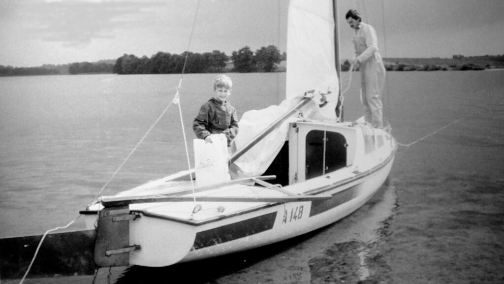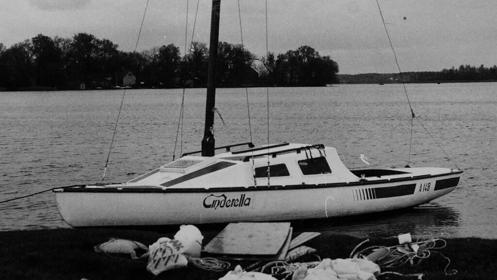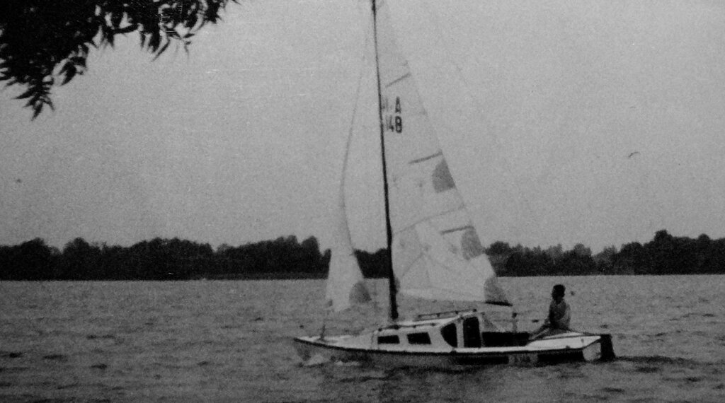 Mirku, można bardzo chcieć, ale fizyka ma swoje prawa. Albo zmieni się kształt podwodzia w Omedze, powiększając wyporność albo będzie musiała to być bardzo leciutka łódka, praktycznie bez balastu. Pewien wpływ będzie miała oczywiście skala modelu, ale w pierwszym wypadku to już nie będzie Omega. Trzymając się początkowej skali od której zacząłem rozważania czyli 1:10 , mamy do czynienia z modelem który powinien mieć masę nie większą niż 400-500 g. Porównuję to z Gringo -1 gdzie jest słomka balsowa i laminat. Kadłub o podobnej długości ale zdecydowanie węższy, czyli rozwiniecie poszycia też jest mniejsze ważył około 200 g. Szacując zwiększoną powierzchnię poszycia o około 50 % i dużo bardziej starając się niż ja w G-1, masa takiego kadłuba może osiągnąć 250 g. Pozostaje 250 g na wyposażenie i takielunek, no i balast. Lekki zestaw serw i zasilania to około 100 -120 g. Odliczając 50 g na takielunek w najlepszym wypadku zostaje około 100 g na balast. Lekka płetwa 10 g - balast 90 g. To nie ma szans na pływanie. Trochę lepiej to wygląda gdy zrobimy model w skali 1:5. Trochę lepiej, bo wyposażenie będzie mialo procentowo mniejszy udział w masie całkowitej. Można powiększyć balast. Kadłub o długości około 1200 mm powinien mieć wyporność około 4 kg. Oryginalna Omega miała 15-18 m^2 ożaglowania. Te 15 to było trochę okrojone wersje, ale nawet dla 15 metrowych żagli model powinien mieć w tej skali (1:5) powierzchnię około 0.6 m^2. To nie mało. Chcąc wiedzieć na jakie wyzwanie się porywamy możemy porównac nasz model OMEGI z jachtem klasy M, budowanym z węgla z bardzo głębokim balstem, wyposażeniem z najwyższej półki itd. o porównywalnej długości około 1270. To odzwierciedla skalę problemów. Pawle, osobiście chcąc mieć model Omegi zdecydowałbym się na replikę, ale nie pływającą. Do pływania, gdyby nadal ręce swędziały coś zupełnie innego. Nie wiem jakie masz doświadczenie, ale celowałbym w IOM-a nawet treningowego na początek, jakąś sprawdzoną konstrukcję, albo choćby w RG-65. Tu też sprawdzonych konstrukcji nie brakuje. Rozumiem Twój sentyment do tej łódki, sporo z nas pierwsze kroki na wodzie stawiało właśnie na Omedze. Sam tak zaczynałem i później sporo pływałem na moim pierwszym "Kopciuszku" poznając podstawy żeglarstwa. 32 lata minęły od zrobienia tego zdjęcia.