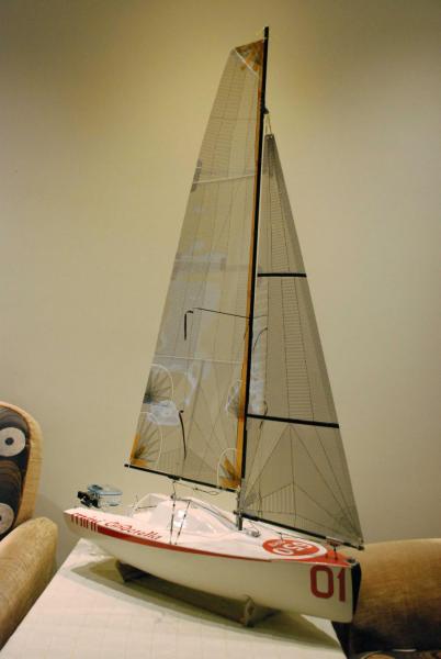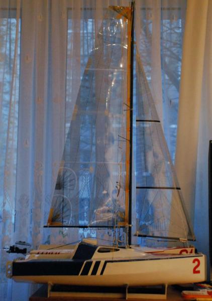 Z wydrukowanych wcześniej arkusików skleiłem nowego grota. Ożaglowany takimi półprzezroczystymi foliakami model wyglada całkiem przyzwoicie. Niestety drukarka laserowa spowodowała lekkie pofalowanie mylaru. Jeżeli będę chciał wykonać żagle z tego materiału, niestety nadruk trzeba robić ręcznie. Dobrze się kleją, gładka powierzchnia temu sprzyja. Formują się też dobrze. No cóż, zdobyte kolejne doświadczenie. Jeżeli pogoda i czas pozwolą, jeszcze je przedmucham na wodzie. Przy okazji taklowania, wymieniłem szoty, na linkę dużo bardziej miekką. Żółty dacron, który do tej pory robił za szoty, pochodzący jeszcze ze strategicznych zapasów, jest trochę za sztywny. Próbnie postawiłem maszt na „dwójce”, jeszcze na miękkich linkach (w/w dacron), ale to pozwala na dokładne pomiary i dobranie długości stalówek. Na zdjęciu MINI 01 otaklowane foliaczkami. Jeszcze wymagaja sporo pracy. Skończyłem linie kadłuba następnej łódki. Sporo pracy, ale to będzie temat na nastepny wątek. Teraz obliczenia płetwy i steru.