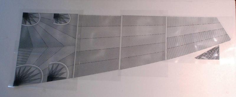Na żywioł. Klepkę królewską (środkową) wyrysowałem oddzielnie, później przygotowałem szablon zbliżony kształtem do łuku na burcie. Przy użyciu tego szablonu wycinam klepki. Metoda prosta, stosunkowo szybka, a ponieważ EL Draco nie jest redukcją i nie muszę się trzymać wzorca, robię je zdecydowanie krótsze. Bardziej chodzi mi o uzyskanie efektu różnego usłojenia, będzie to słabo widoczne po bejcowaniu, ale będzie. Nie chciałem robic gładkiego pokładu z duzych płaszczyzn. Na burtach będzie łatwiej, tam pójdą dłuższe klepki. Mniej do ułożenia. Jeszcze prostrzym sposobem byłoby przygotowanie całego pokładu i wyklejenie go. Ale na ten wariant się nie zdecydowałem. Za duzo dziur na podwięzie. Tu zależało mi też na wadze. W sumie pokład ma tylko 3 mm grubości. Poprawiłem z tym promieniem, żeby nie mieszać. -
