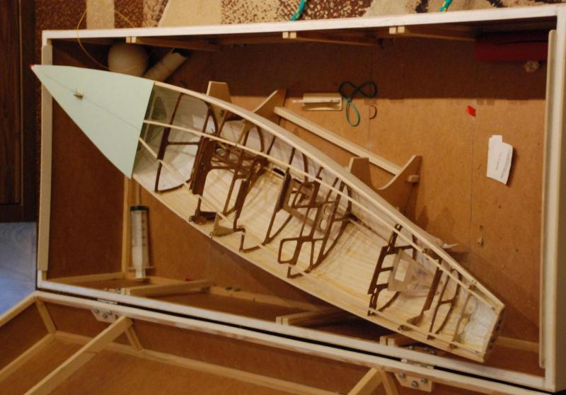 Rozpocząłem klejenie pokaldu. Traktuję to trochę eksperymantalnie, jeszcze nie wiem jaki będzie efekt końcowy. Trochę to przypomina zabawy w inatrsję, z drobną różnicą, tu efekt ozdobny chcę uzyskać stosując ten sam gatunek drewna, czyli balsę. Balsa o różnych kolorach i usłojeniach po barwieniu da (mam nadzieję) oczekiwany efekt klepek. Na jachtach klepki były długie, tu pozwoliłem sobie na ich skrócenie. Ot taki balsowy parkiecik. Przy grubości deseczki 1.0 mm długość robi problemy. Drobna uwaga. Widać kilka klepek z charakterystycznym usłojeniem, błyszczami. To najlepszy materiał na delikatne balsowe spływy, najmniej podatny na wichrowanie. Gdy wybierałem materiał na skrzydła takie deski po ważeniu zawsze były odkładane. Dotyczy cienkich profili (6-7%), przy takim np. Clarku Y (12,7%) to byłaby nadgorliwość. Jak zobaczyłem co nawyklejałem to pomyślałem " o jeżu kolczasty" -