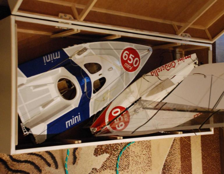 Mirku mam nadzieję, że nie mnie miałeś na myśli. Do mistrza to ho ho ho albo jeszcze dalej. Pomocnik czeladnika to chyba bardziej właściwe określenie. Obserwując to co za oknem dochodzę do wniosku że testy nowych żagli będą dopiero na wiosnę, chociaż mam w pamięci zeszłoroczne pływanie w drugiej połowie grudnia. Nie mogłem sobie odmówic przyjemności i zrobiłem zdjęcie plenerowe pokazujące nowy maszt na łódeczce i "oszustwo fotgraficzne" na którym żagle z MINI 01 markują żagle w 02. Chciałem porównać sylwetki. Coraz bardziej dojrzewa we mnie myśl o przebudowie pokładówki w MINI 01, na podobną do tej z 2. Odpadło by zaklejanie luku, a i sylwetka chyba byłaby ładniejsza. Tu jeszcze cały czas się wacham. Wtedy mógłbym też zmienić system sterowania płetwami. Zbyt wiele myśli. Zauważyłem, że wkleiłem (234 zamiast 235) nie te zdjęcie co chciałem.
